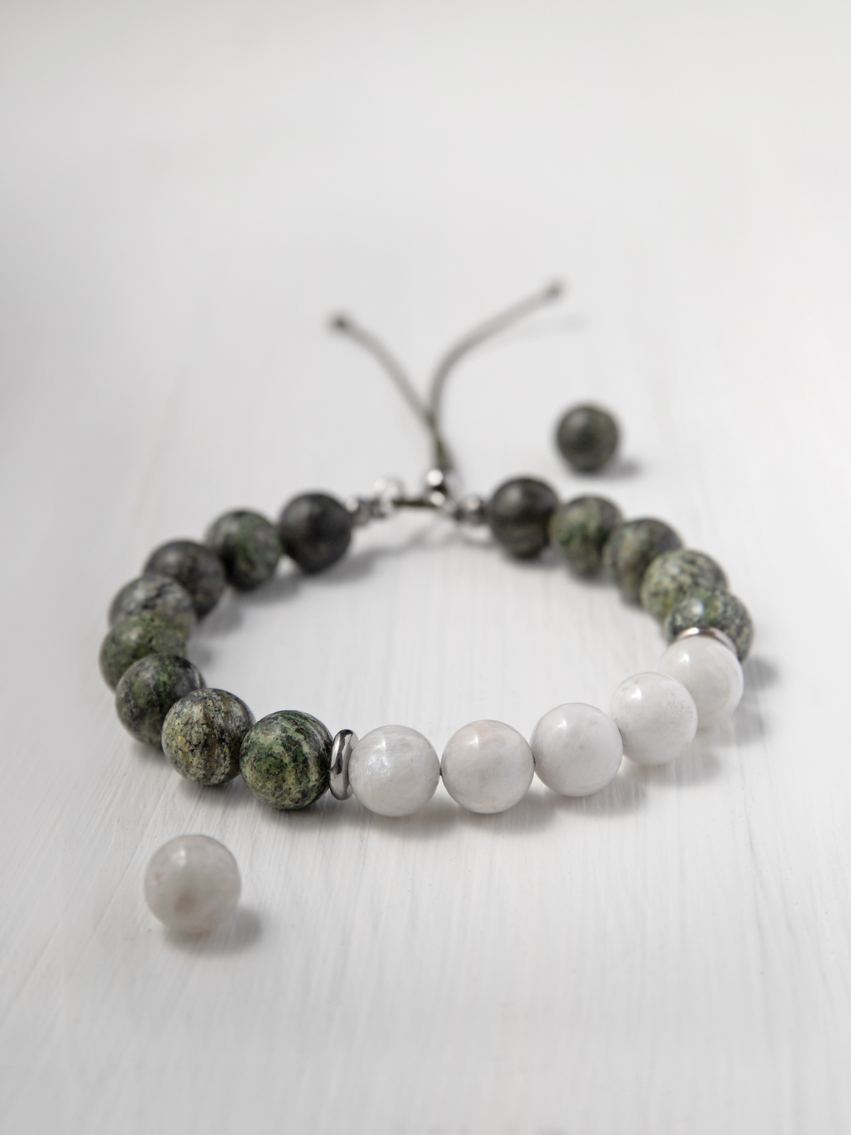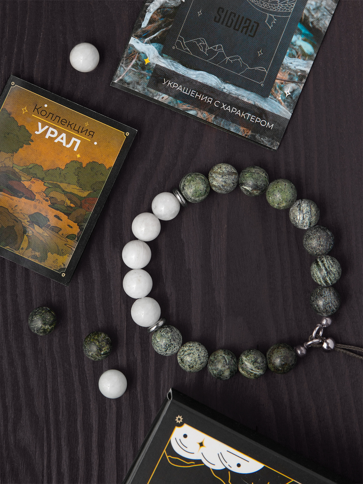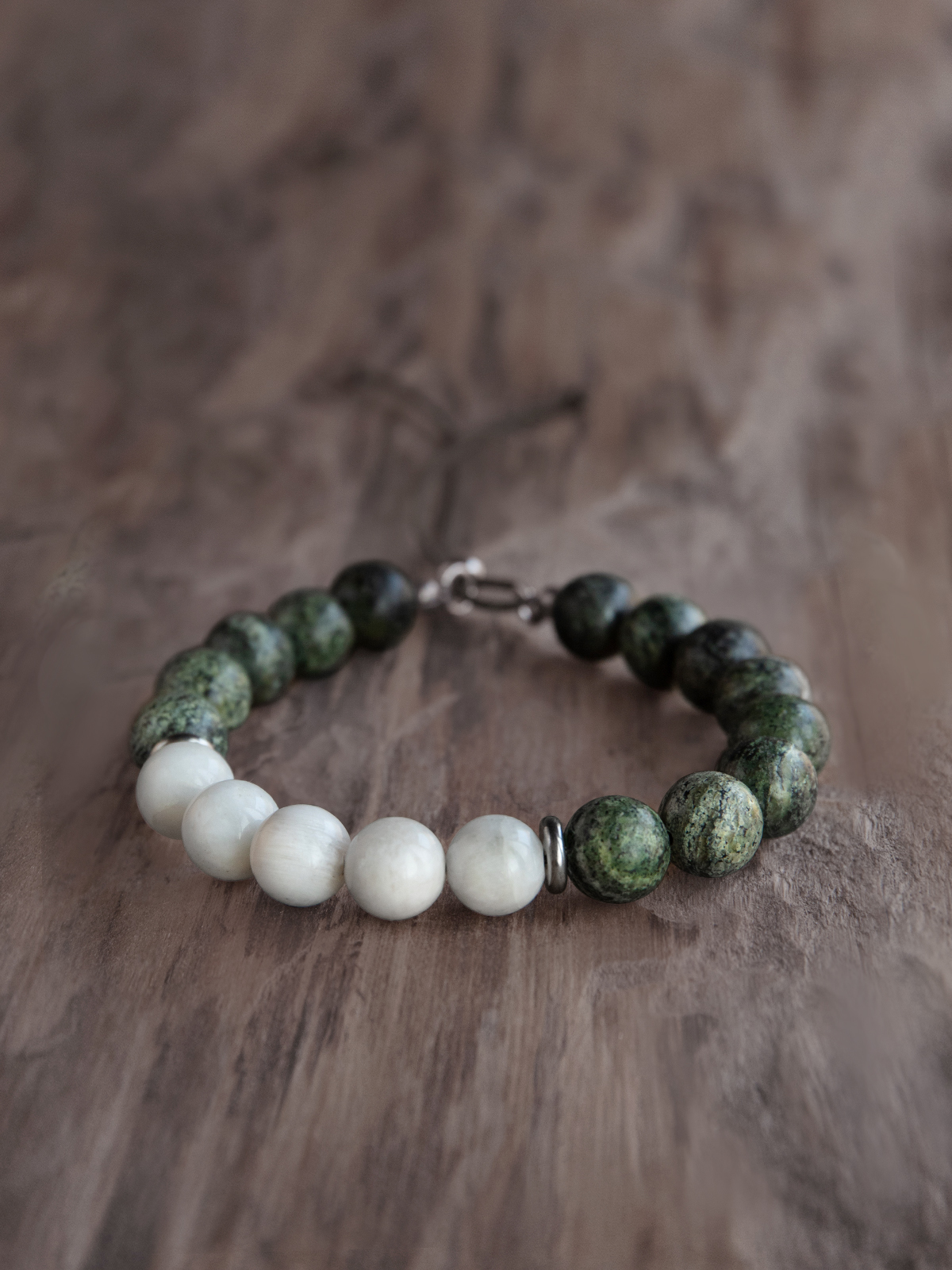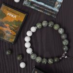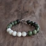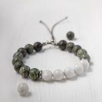 Ак елан — браслет из змеевика с амфиболитом и лунного камня.