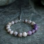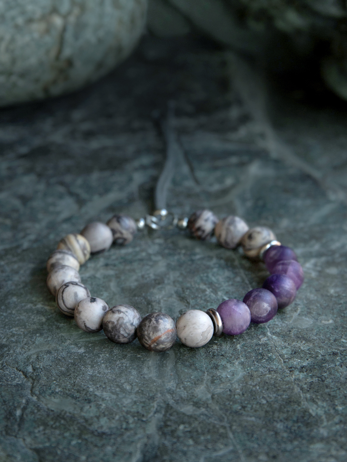 Аметист — символ духовного баланса, мистических знаний и творческого начала. Люди верят, что он дарит внутреннюю гармонию, ясный ум и эмоциональное равновесие, вдохновляет и обостряет интуицию, делает владельца притягательнее и мудрее. Серая яшма — древний оберег, бывший в чести даже у великих королей и жрецов. Её закладывали в подолы плащей и носили в кошелях, украшали ею шлемы и порталы храмов, чтобы уберечься от злых сил. Считается, что она отводит печали и тоску, житейские проблемы и всякое человеческое зло.
