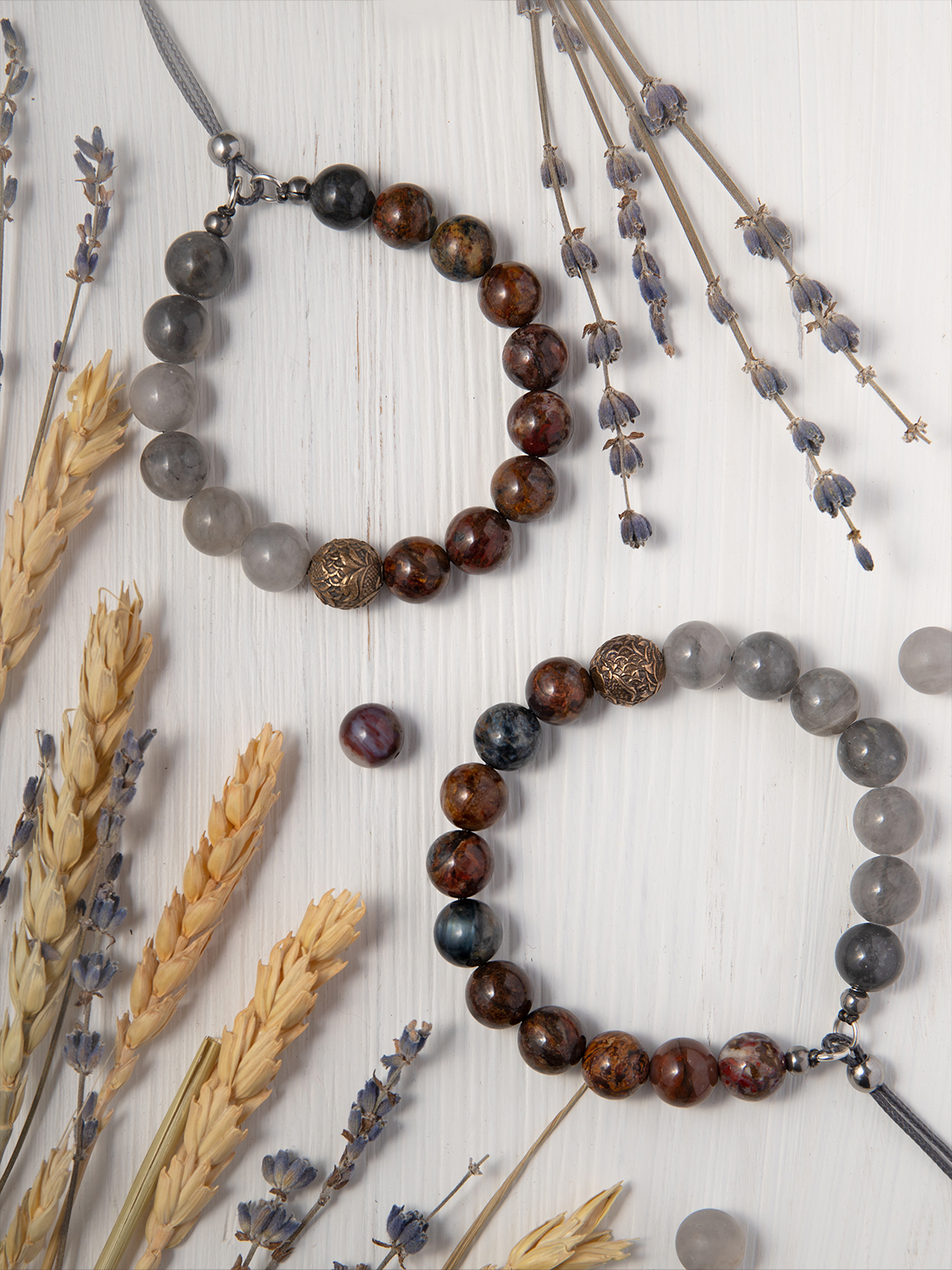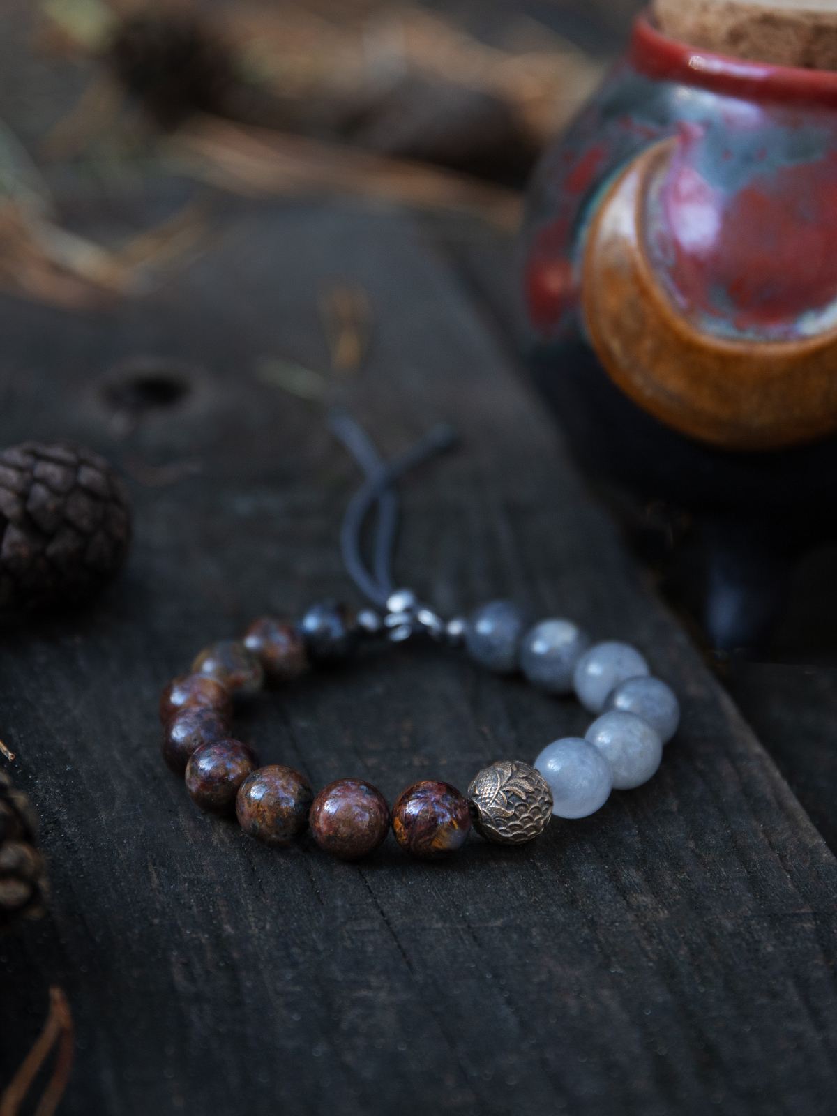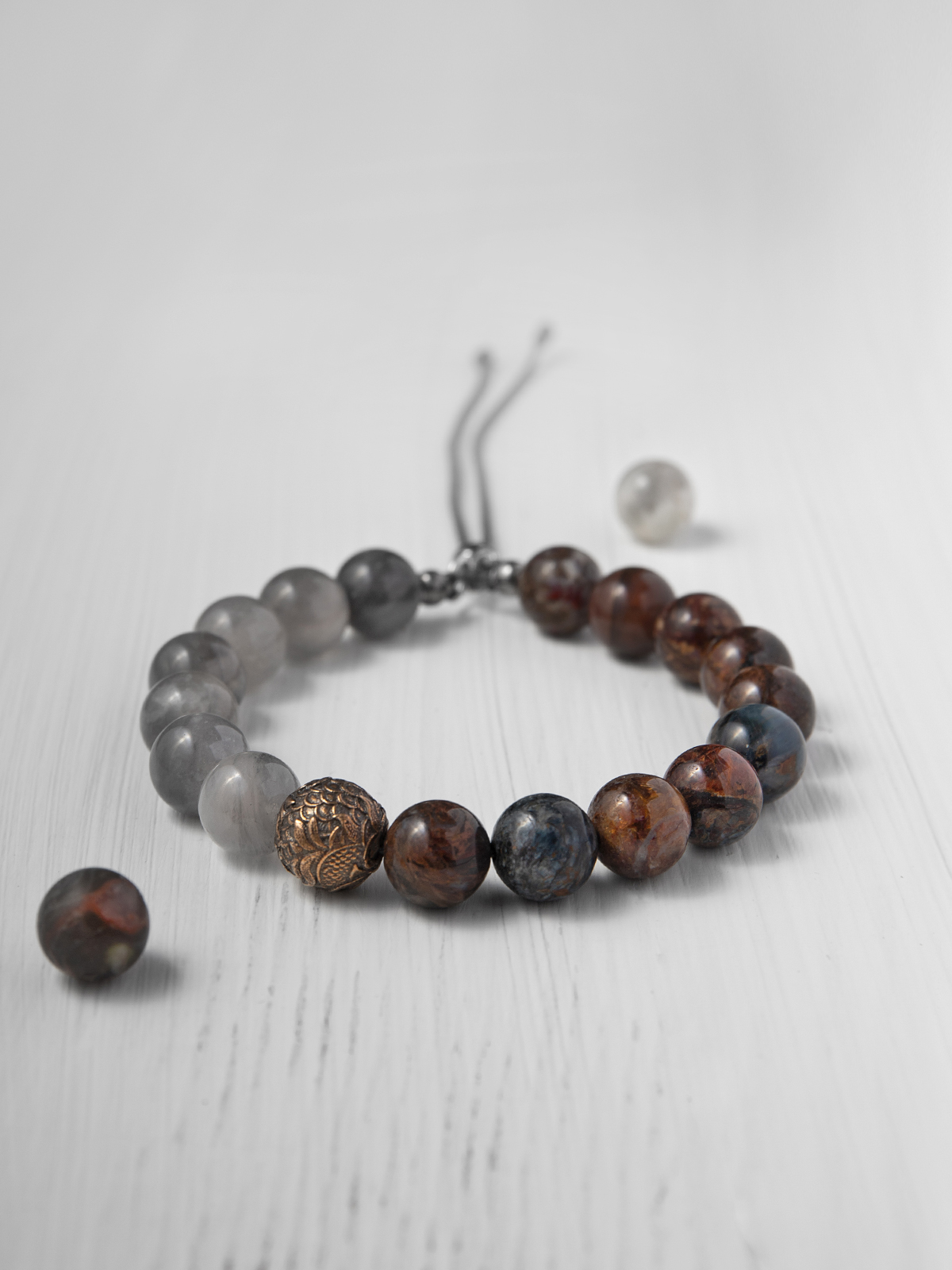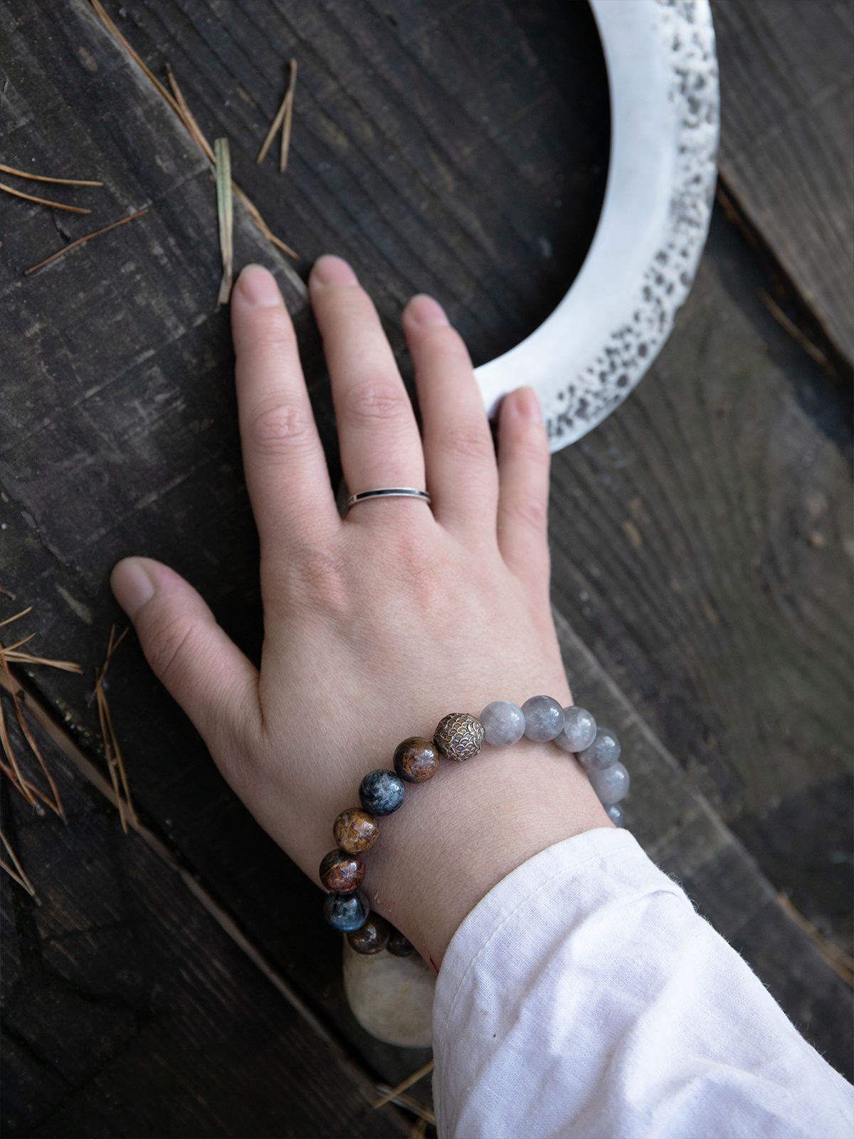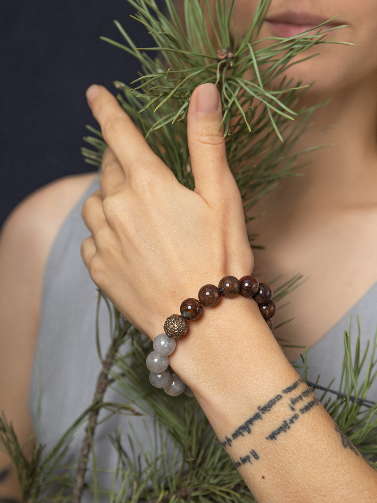 Сфорца — браслет из питерсита и облачного кварца, с бронзовой бусиной.