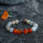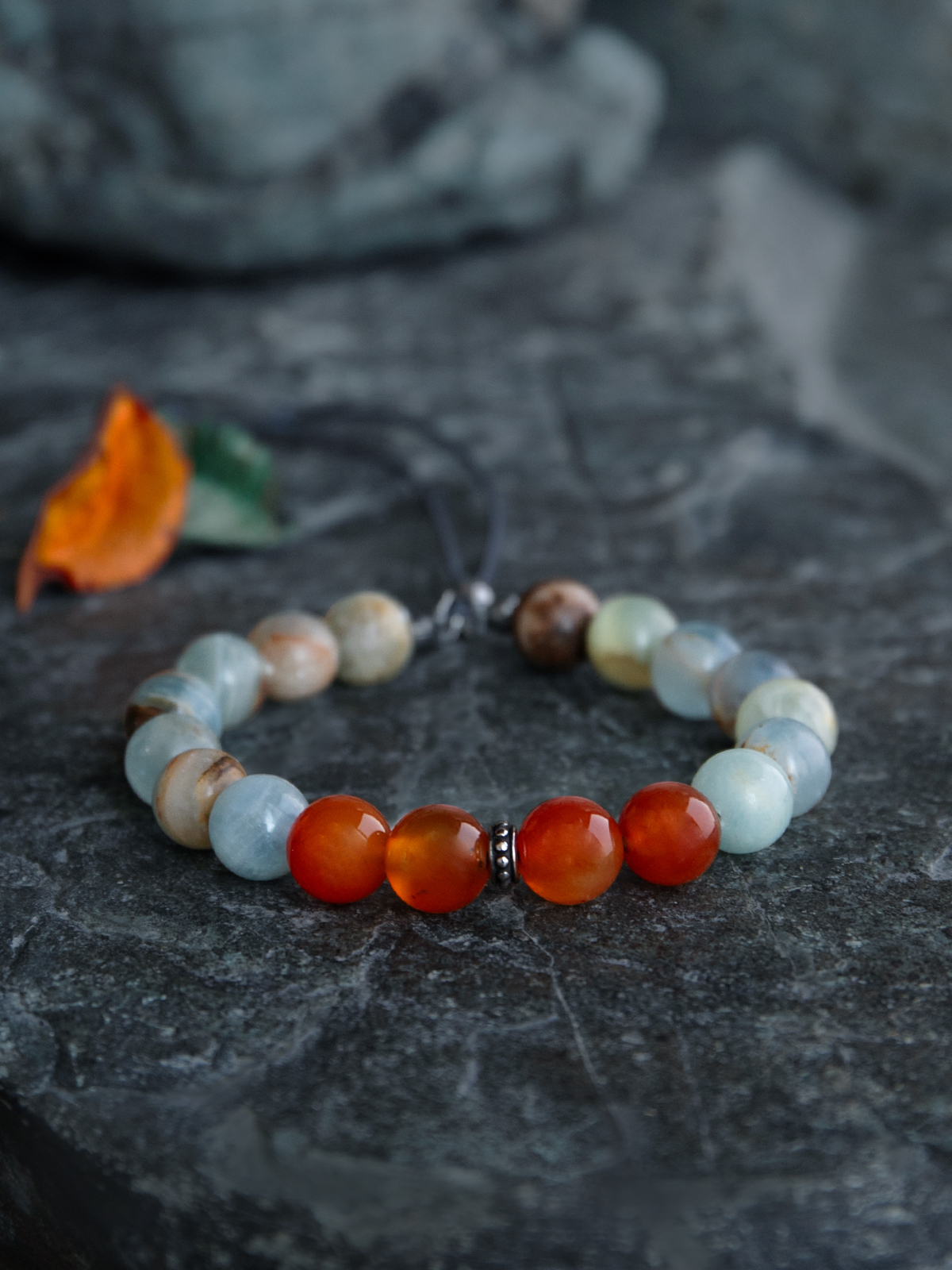 Голубой кальцит — символ безмятежности и умиротворения, обновления и позитивных перемен. Считается, что он помогает сконцентрироваться и найти свой источник вдохновения, очистить мысли от суеты и пустых тревог, принять жизнь такой, какая она есть и исцелить душевные раны. Сердолик — символ огня небесного и земного. Он ассоциируется с уверенностью и энергичностью, удачливостью и стойкостью к невзгодам, творческим началом. Считается, что камень помогает обрести сердечных друзей, быть открытым и милосердным, проявлять свои лучшие стороны и оставаться верным своей морали.