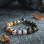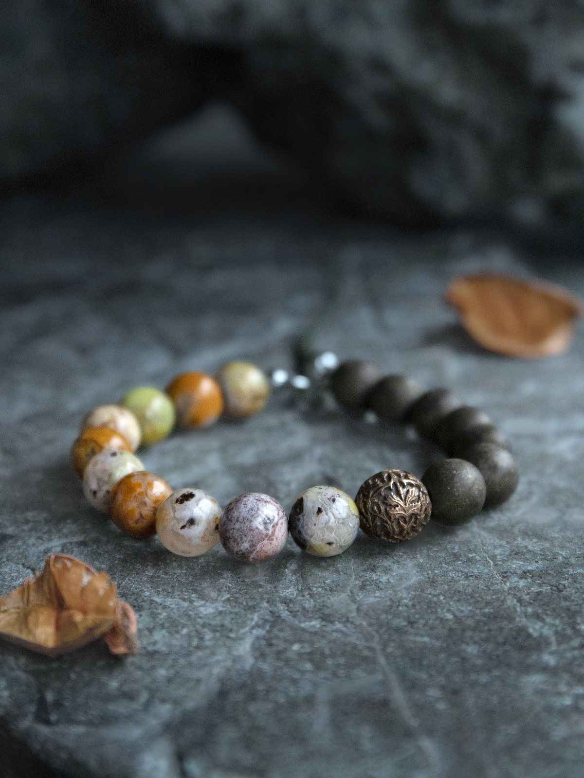 Дал Риада — браслет из пирита и цветочного агата, с бронзовой бусиной.