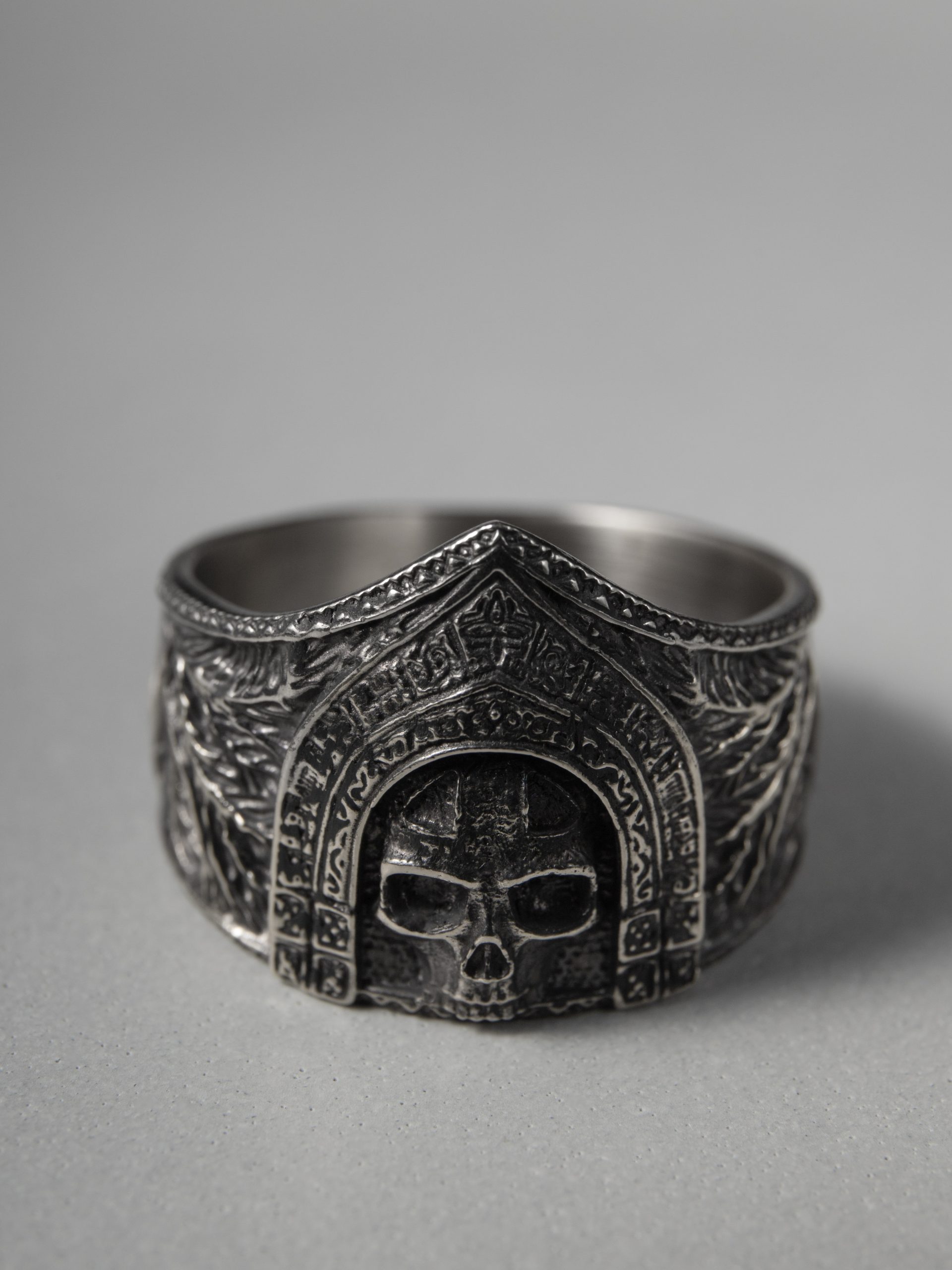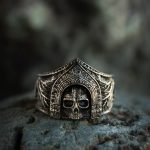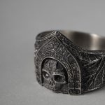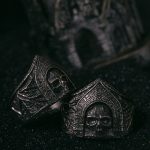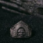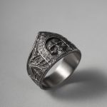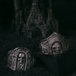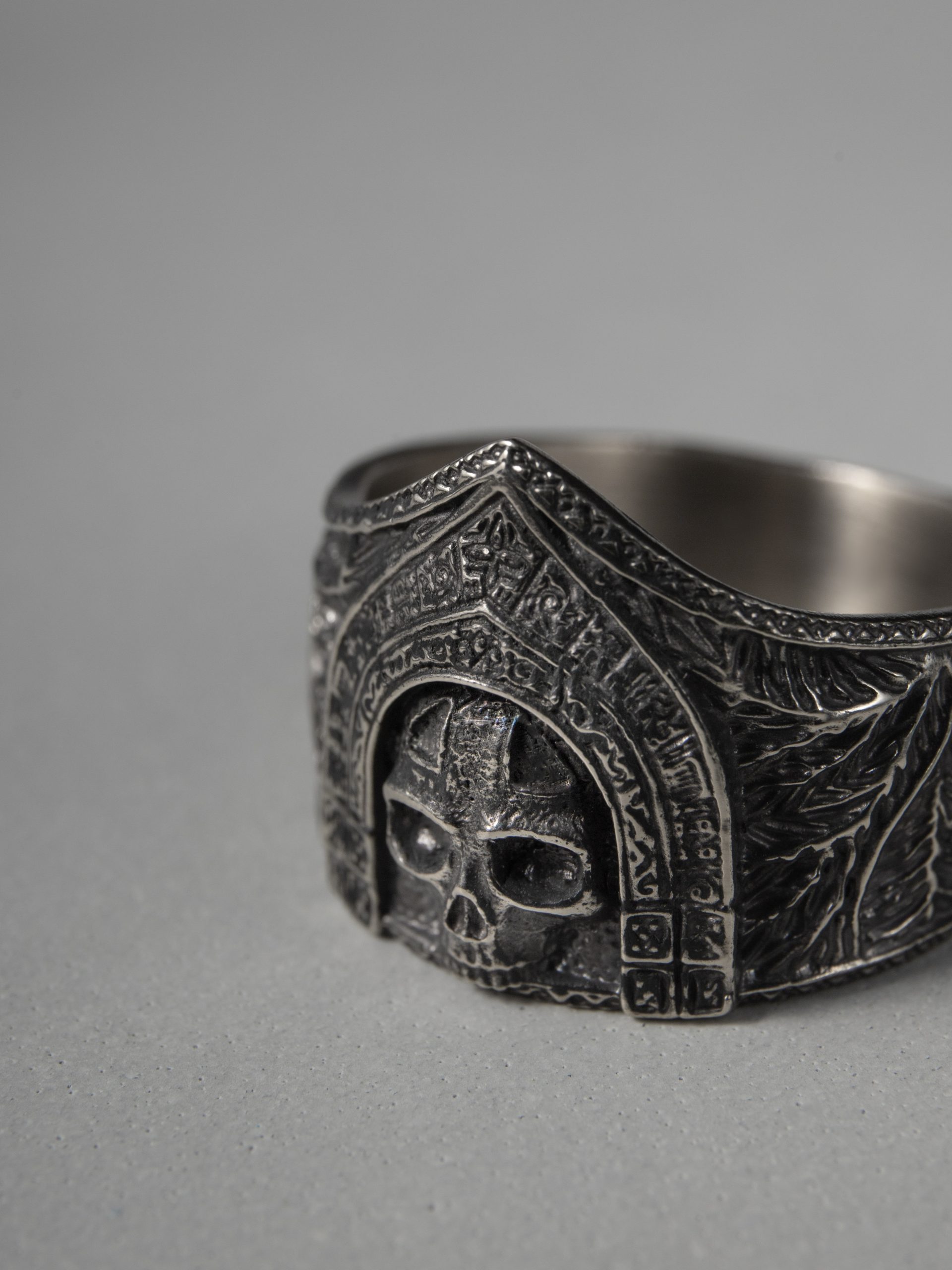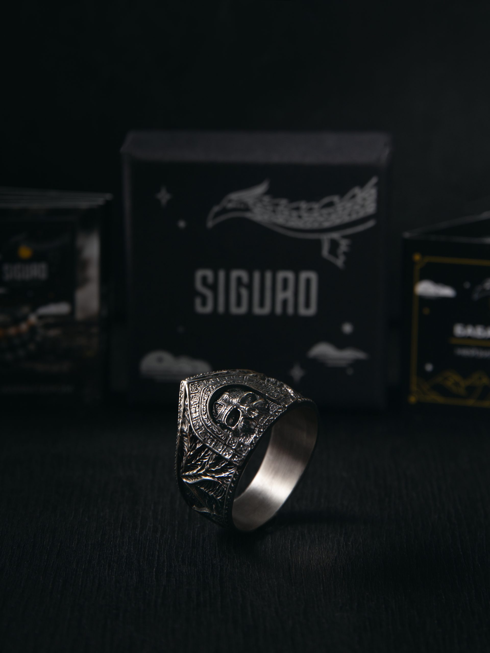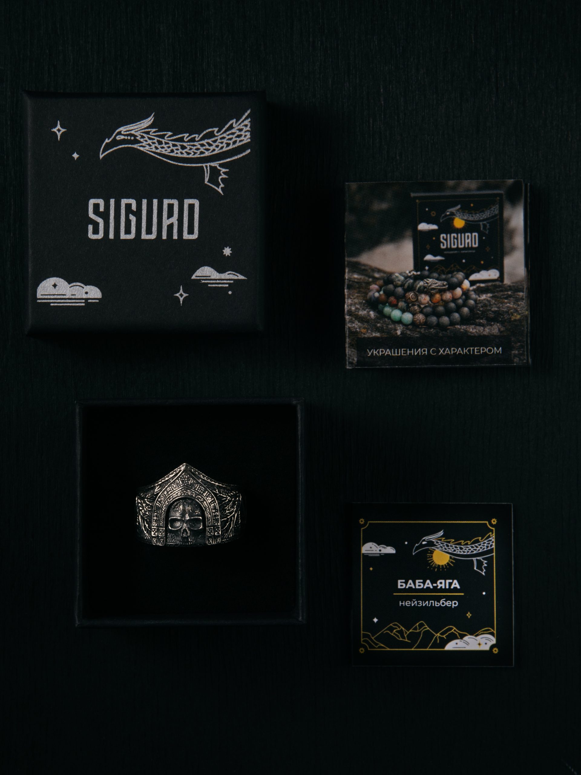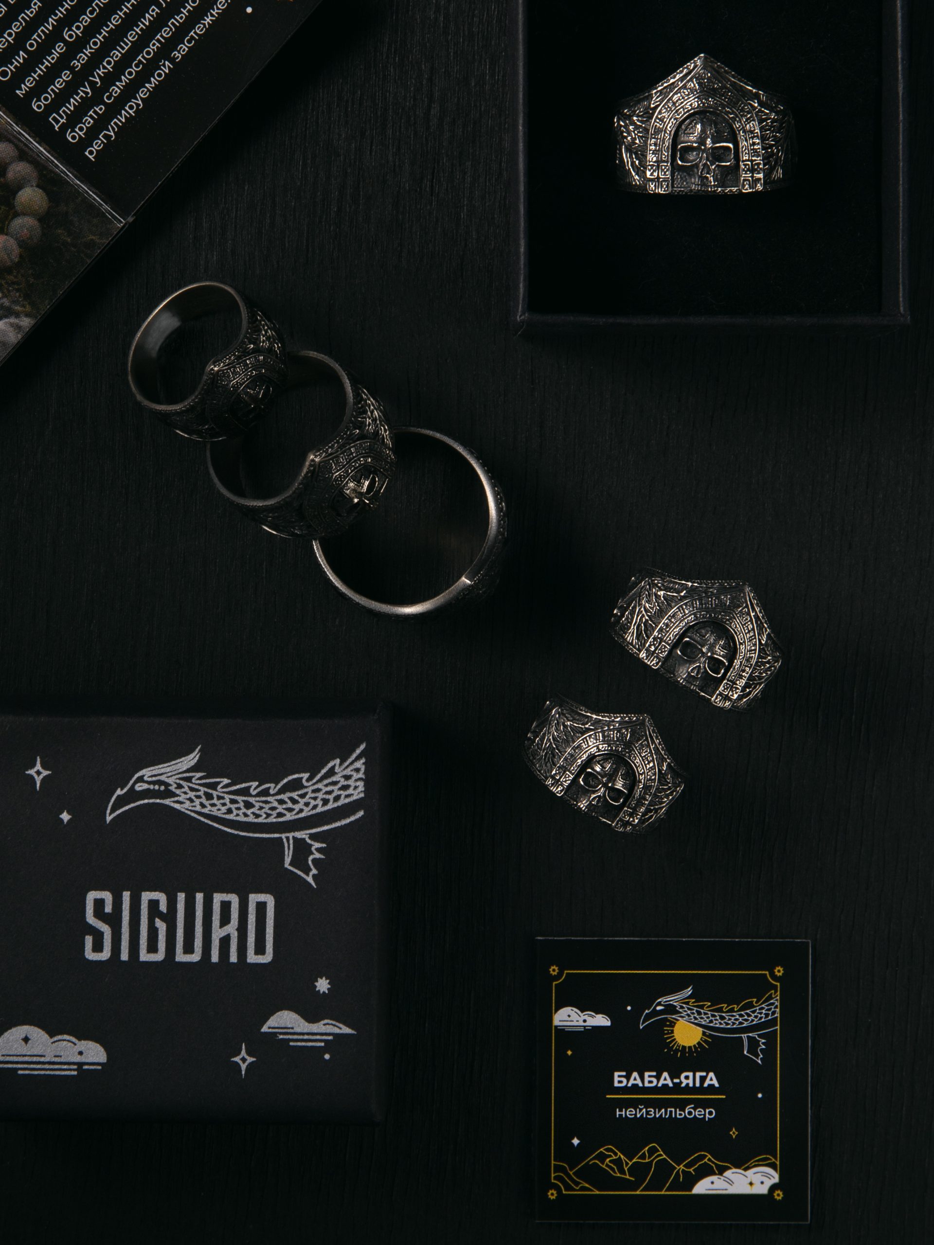 Кольцо отлито из нейзильбера — серебристого сплава меди, никеля и цинка. Не ржавеет, но может со временем потемнеть. Чтобы вернуть блеск, можно использовать средства по уходу за серебром, слабокислые растворы (уксус, лимонная кислота) или мягкие абразивы.