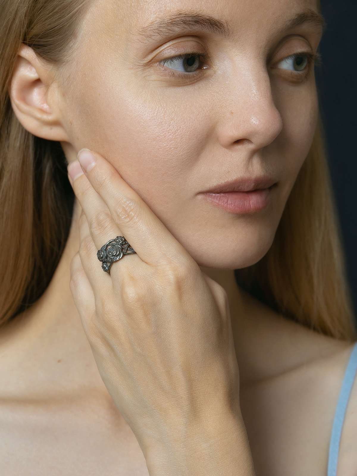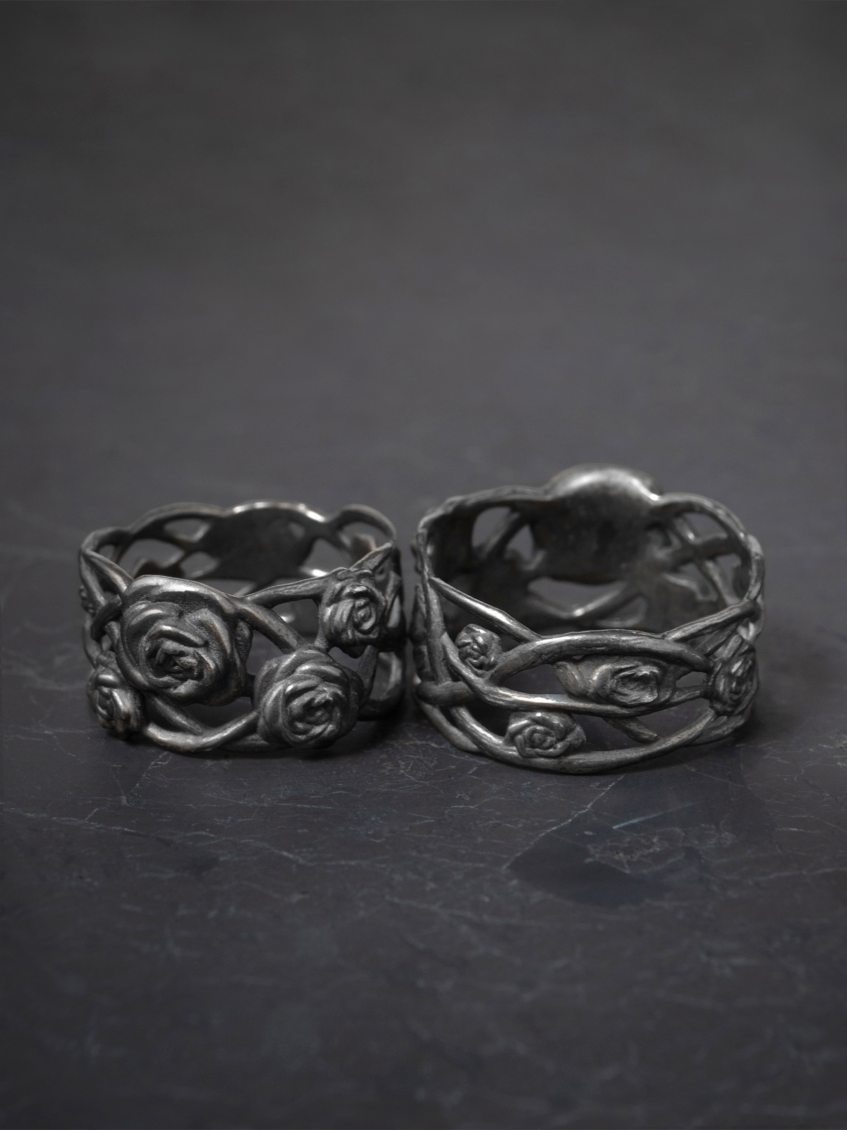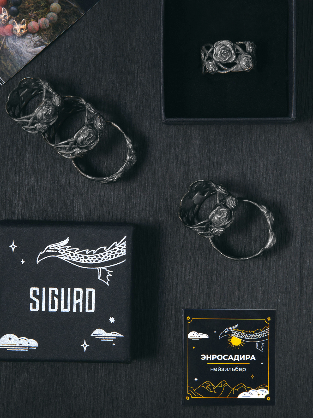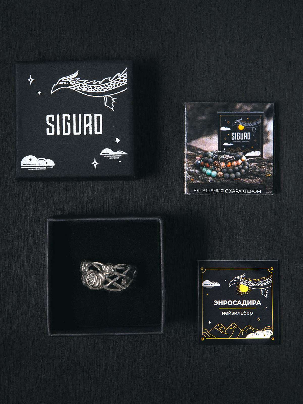 Кольцо отлито из нейзильбера — серебристого сплава меди, никеля и цинка. Не ржавеет, но может со временем потемнеть. Рекомендации по уходу: протирать ворсистой тканью со слабокислым раствором (уксус, лимонная кислота), специальными средствами для ухода за серебром, мягкими абразивами.