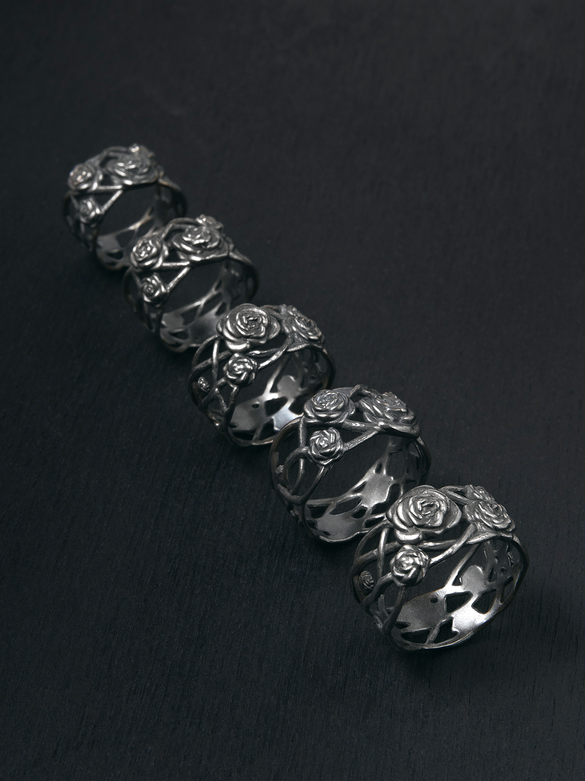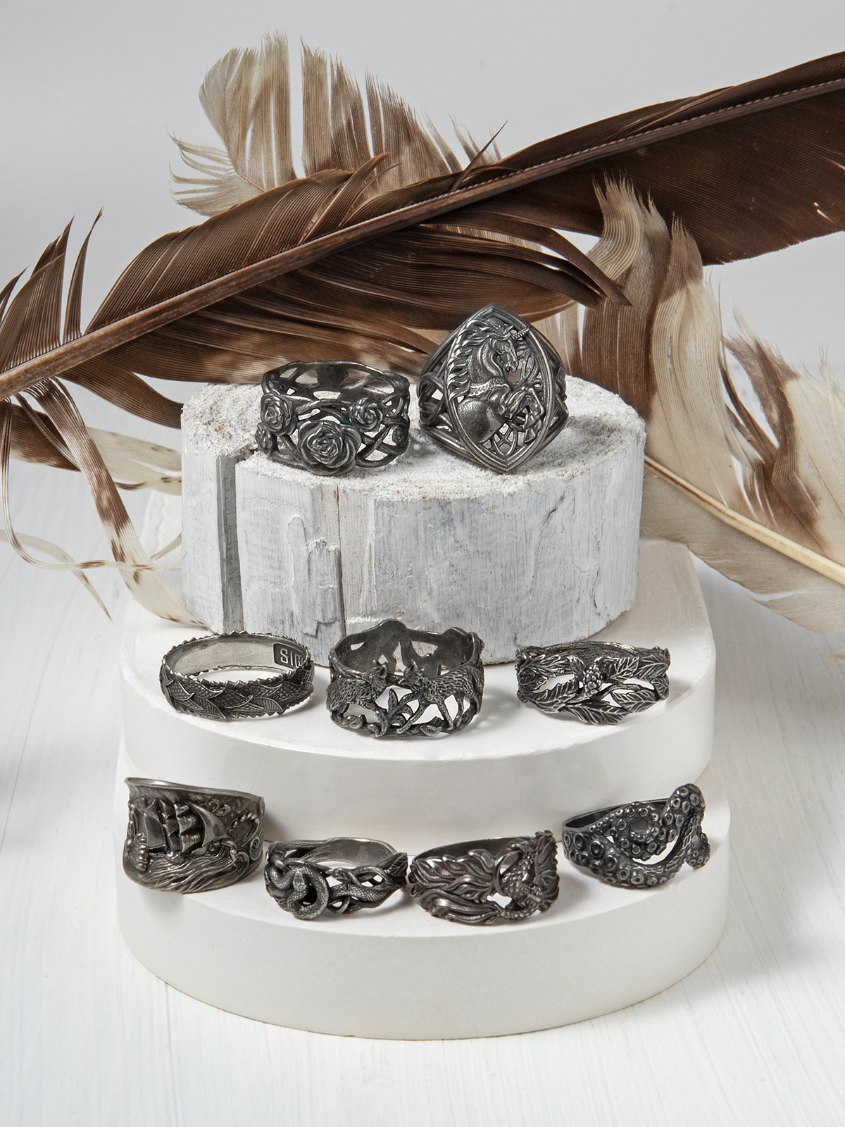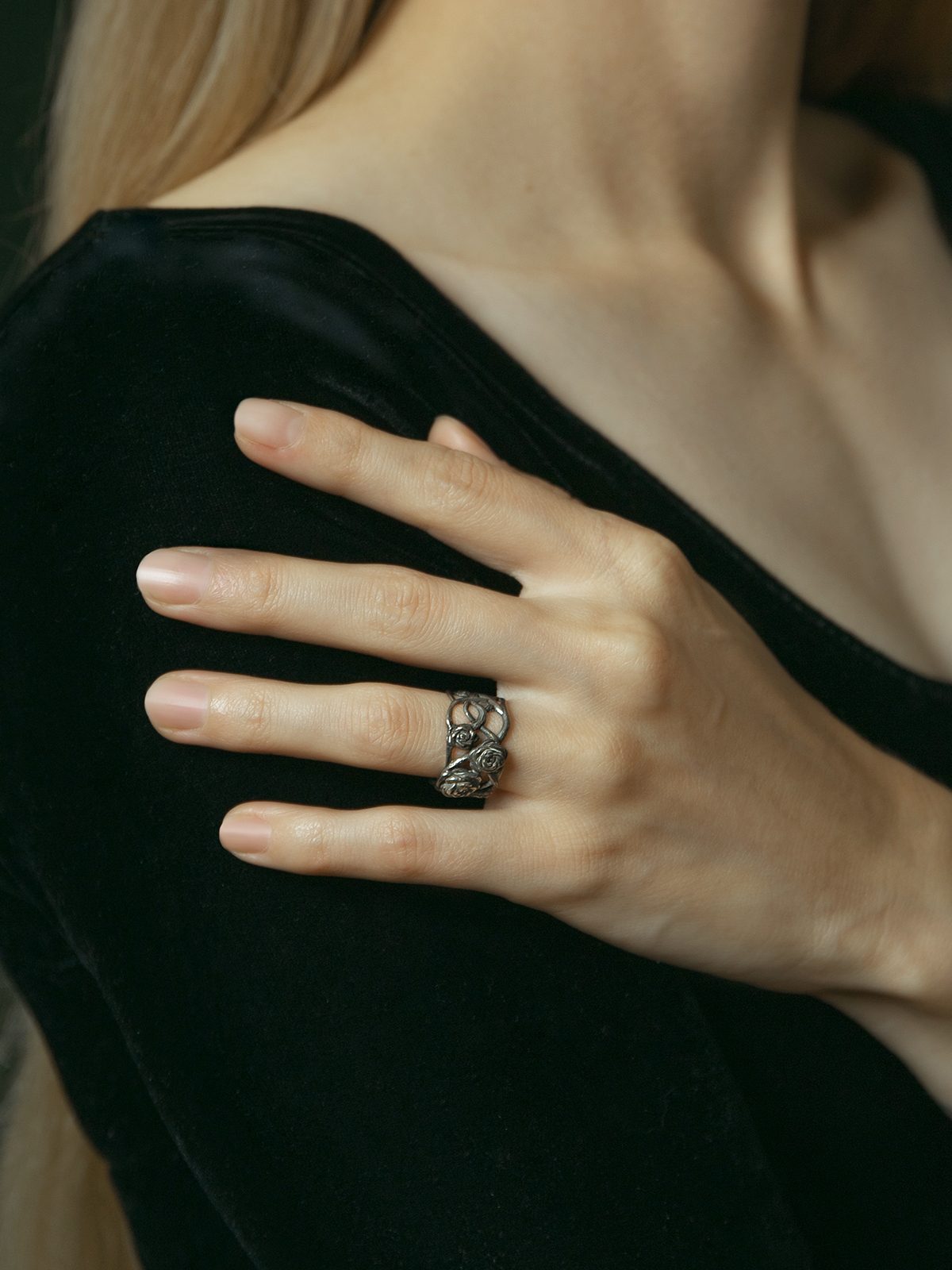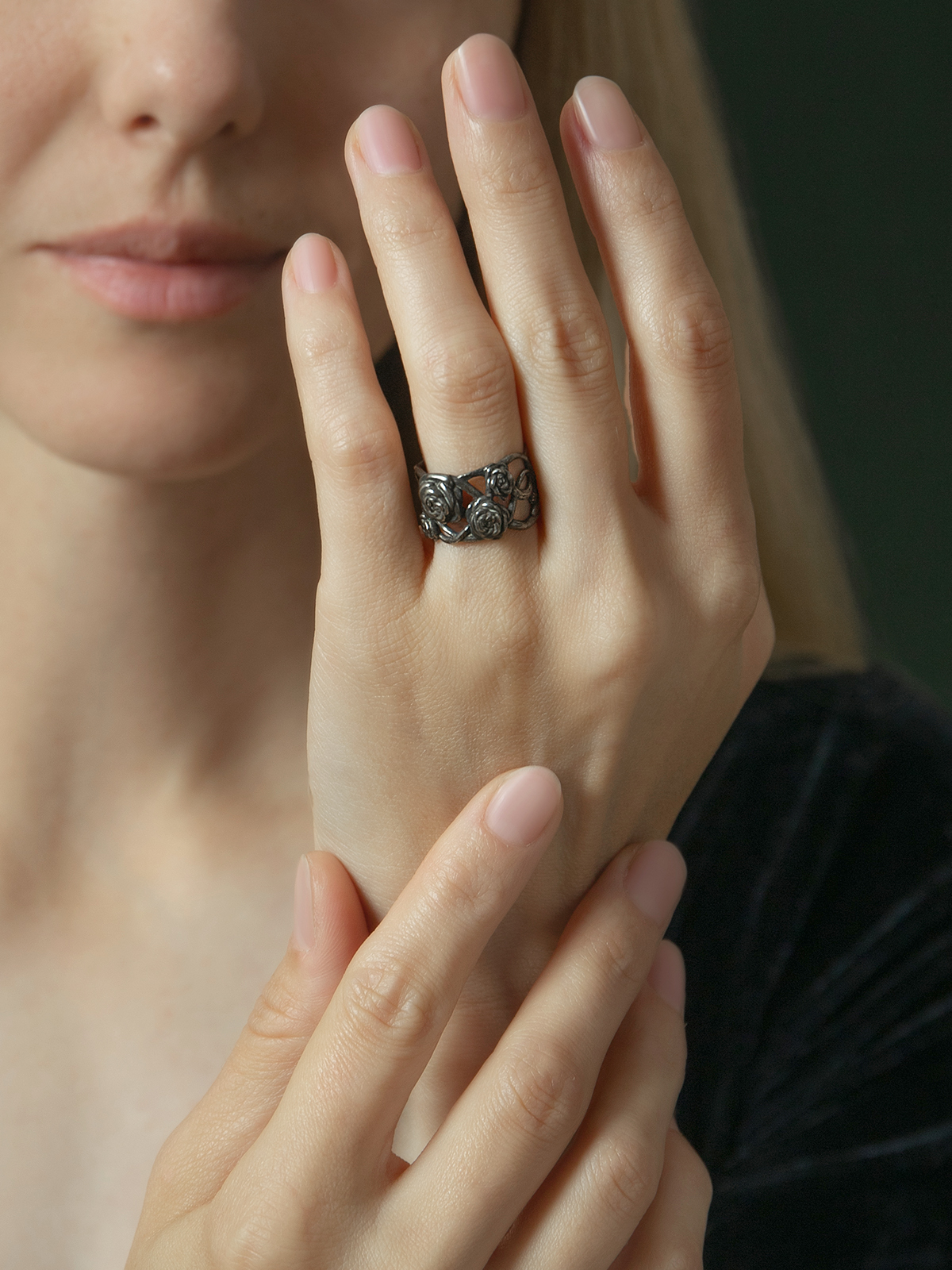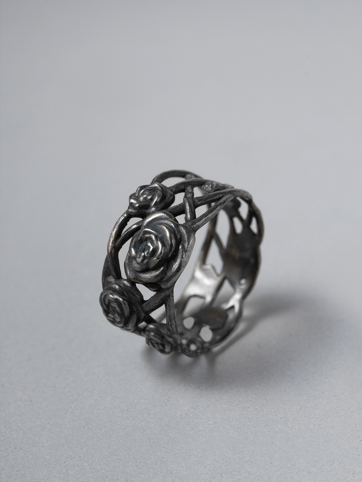 Кольцо отлито из нейзильбера — серебристого сплава меди, никеля и цинка. Не ржавеет, но может со временем потемнеть. Рекомендации по уходу: протирать ворсистой тканью со слабокислым раствором (уксус, лимонная кислота), специальными средствами для ухода за серебром, мягкими абразивами.