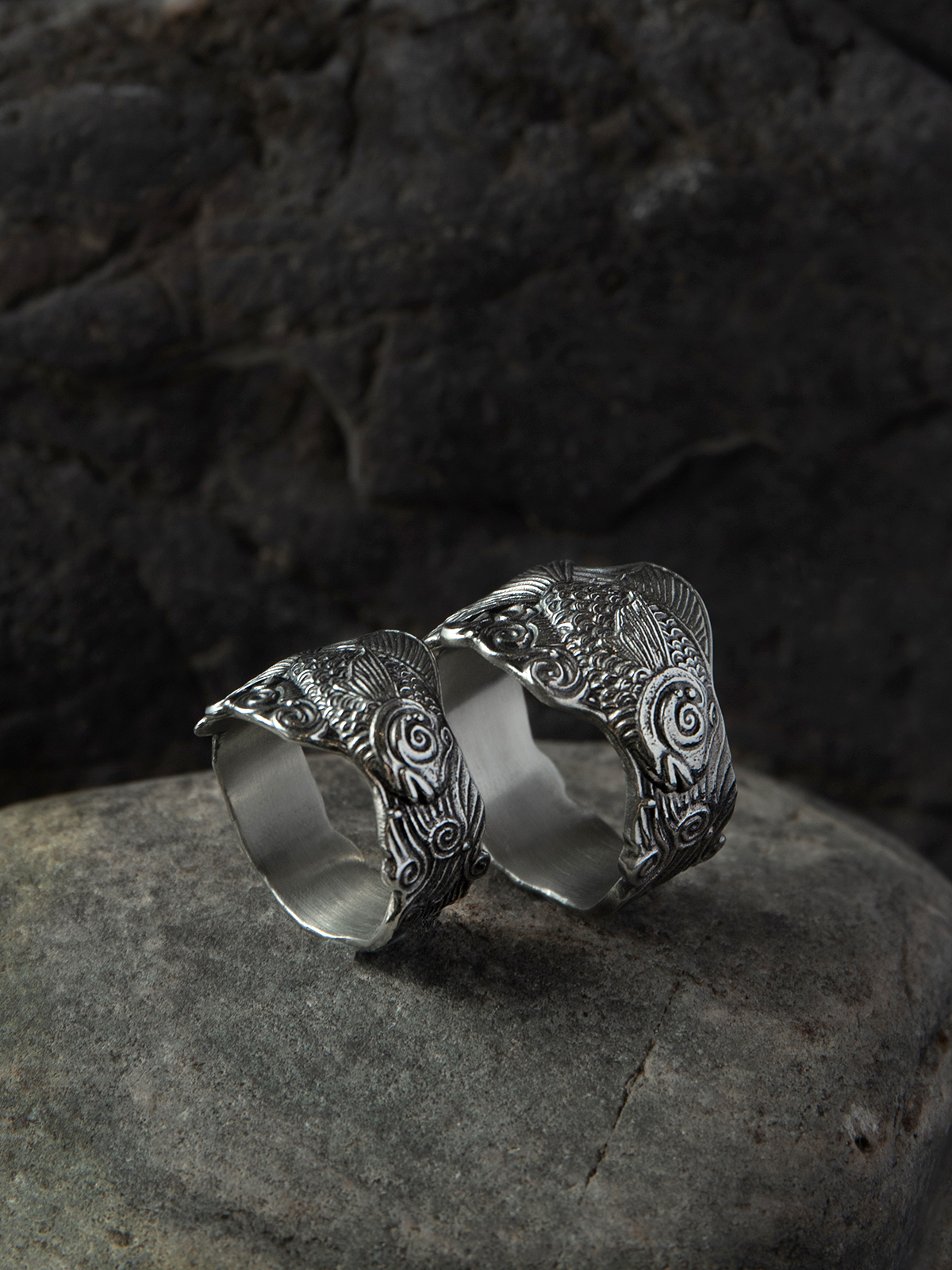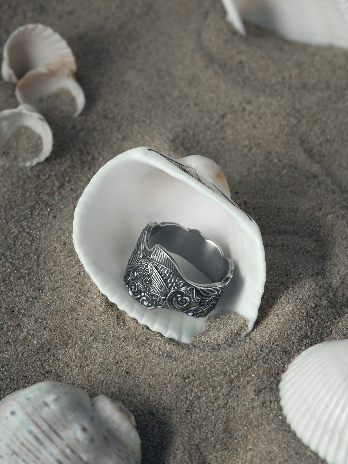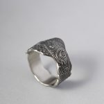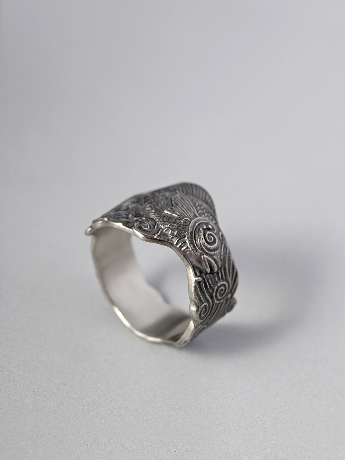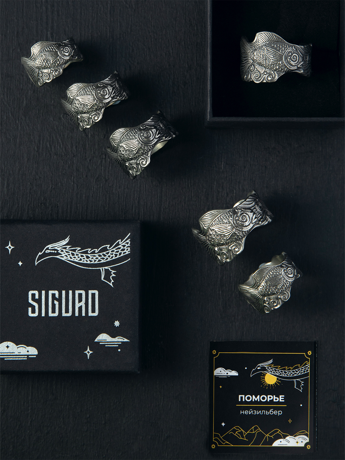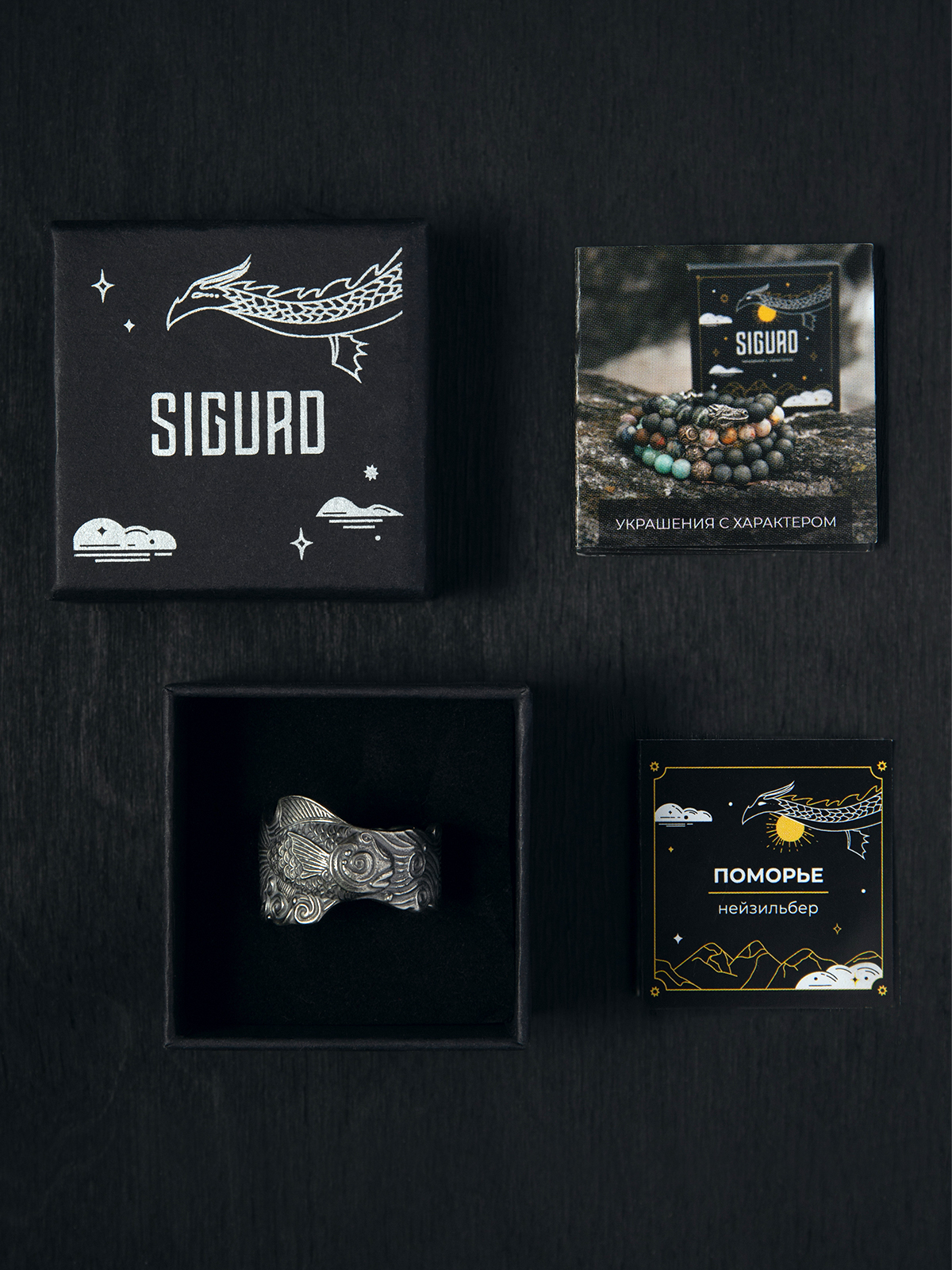 Кольцо отлито из нейзильбера — серебристого сплава меди, никеля и цинка. Не ржавеет, но может со временем потемнеть. Чтобы вернуть блеск, можно использовать средства по уходу за серебром, слабокислые растворы (уксус, лимонная кислота) или мягкие абразивы.