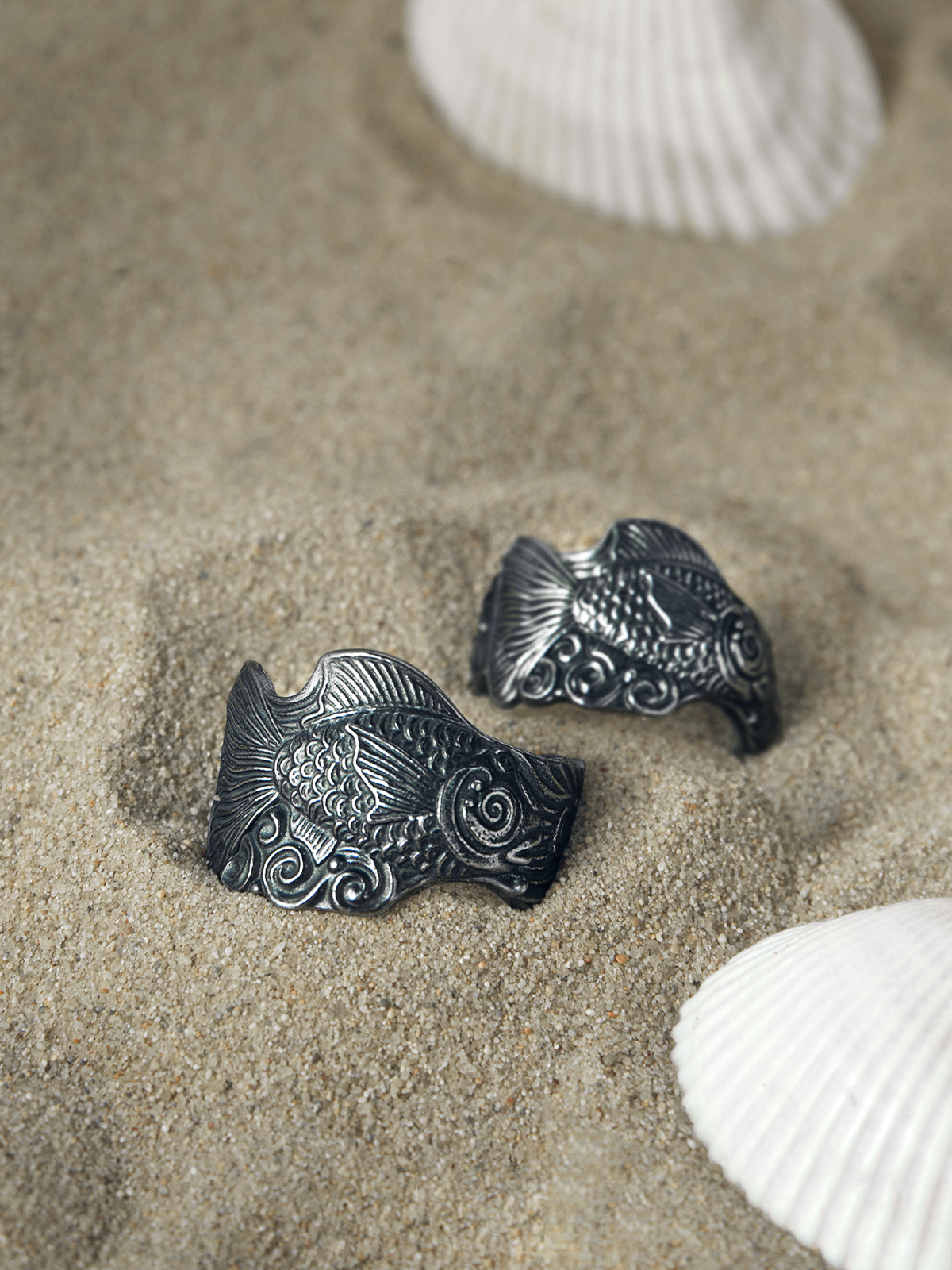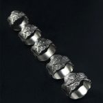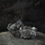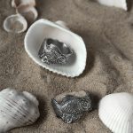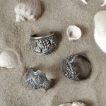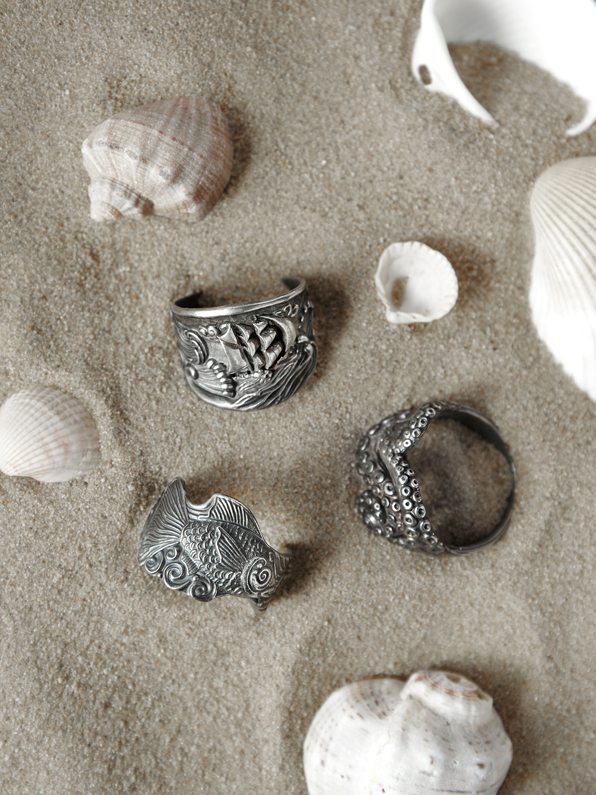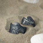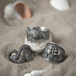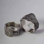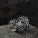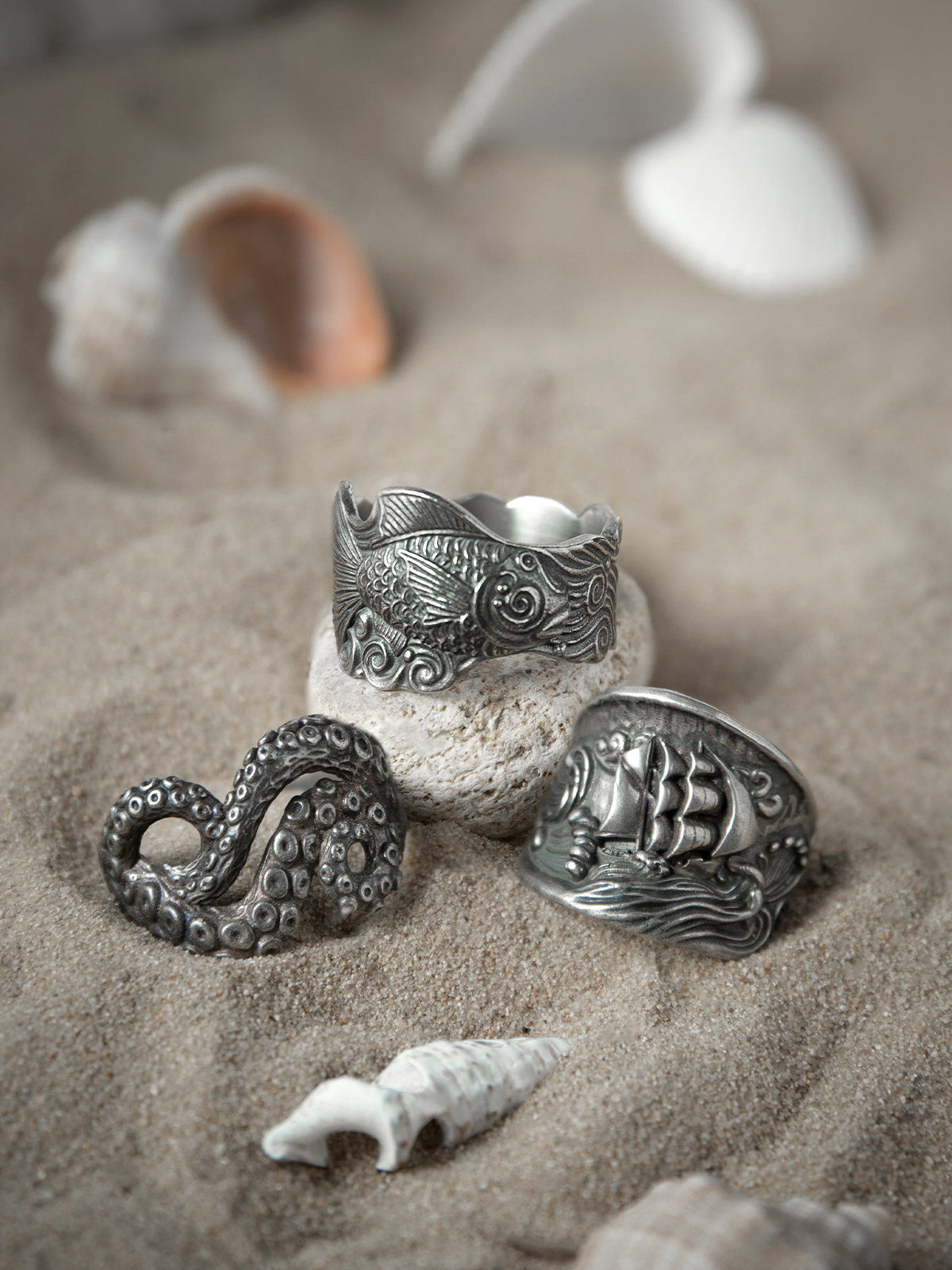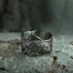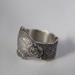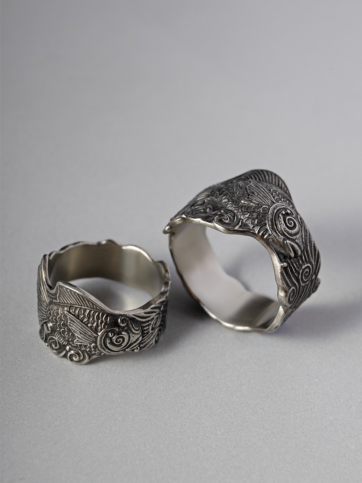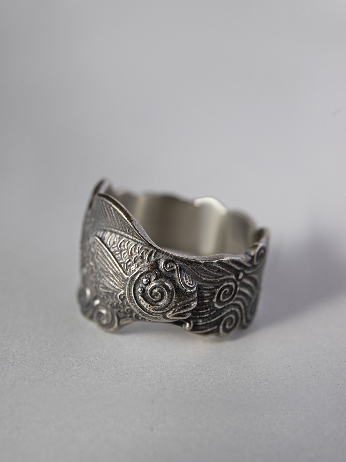 Кольцо отлито из нейзильбера — серебристого сплава меди, никеля и цинка. Не ржавеет, но может со временем потемнеть. Чтобы вернуть блеск, можно использовать средства по уходу за серебром, слабокислые растворы (уксус, лимонная кислота) или мягкие абразивы.