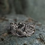 Украшение из нейзильбера не заржавеет и не облезет со временем в процессе ношения — на нём нет покрытия, это собственный цвет металла. Авторский дизайн изображает существо, схожее с птицей и драконом, с огненными крыльями, и подходит мужчинам и женщинам. Широкий размерный ряд позволяет использовать его как парное или обручальное кольцо.