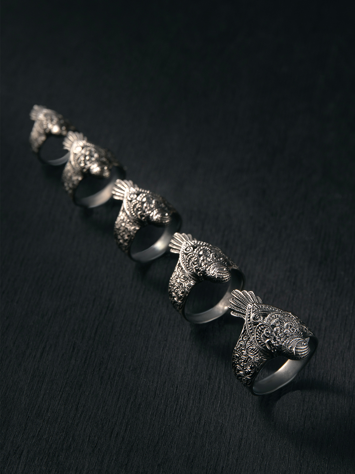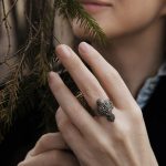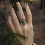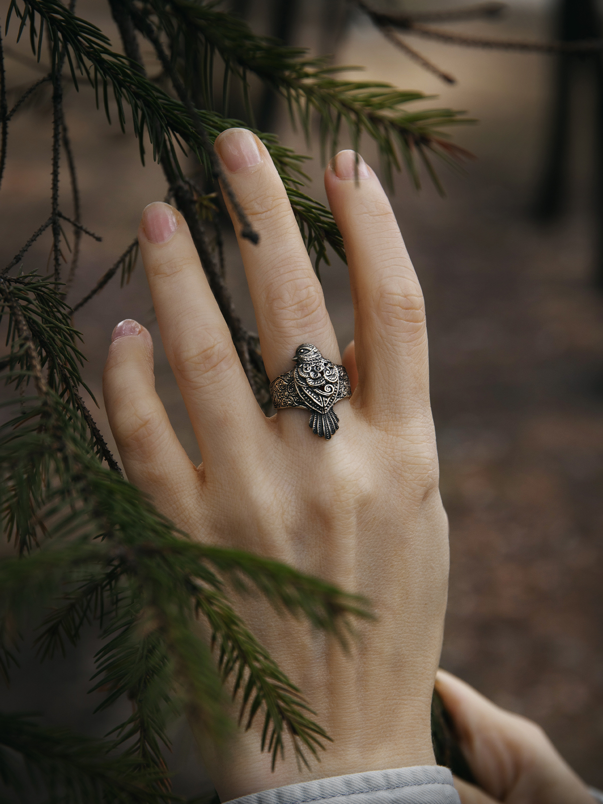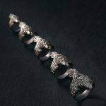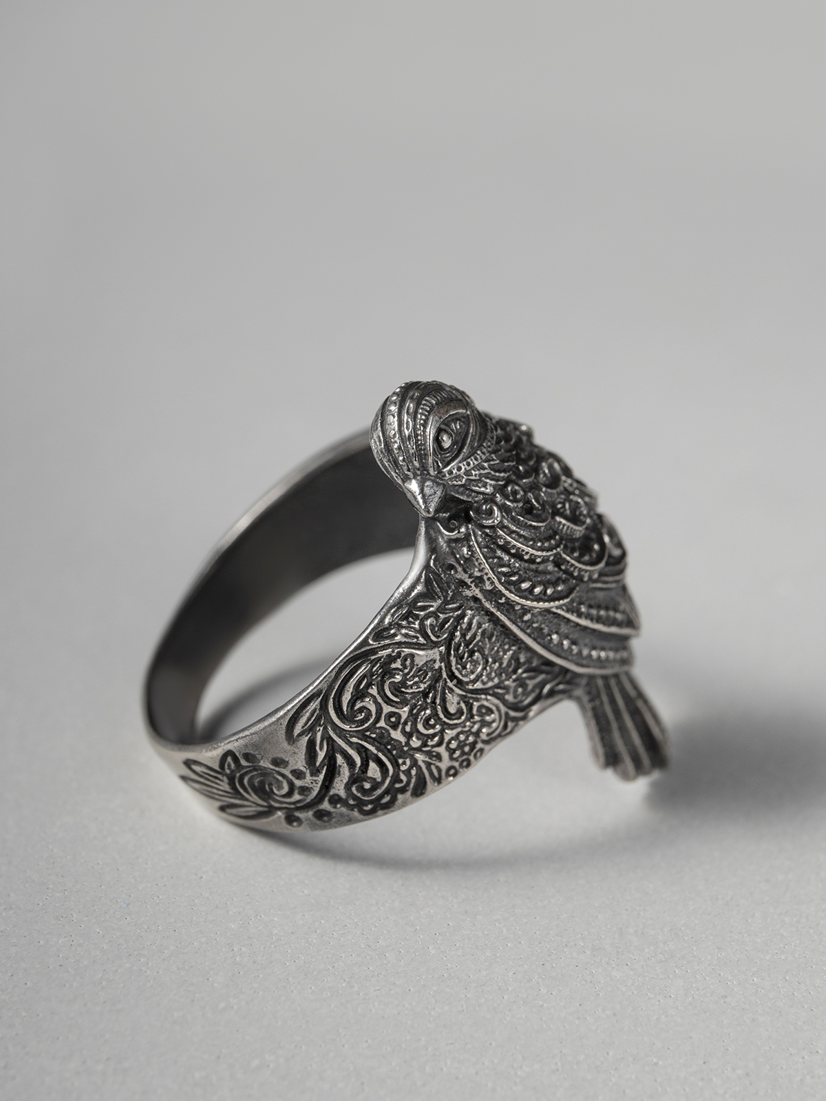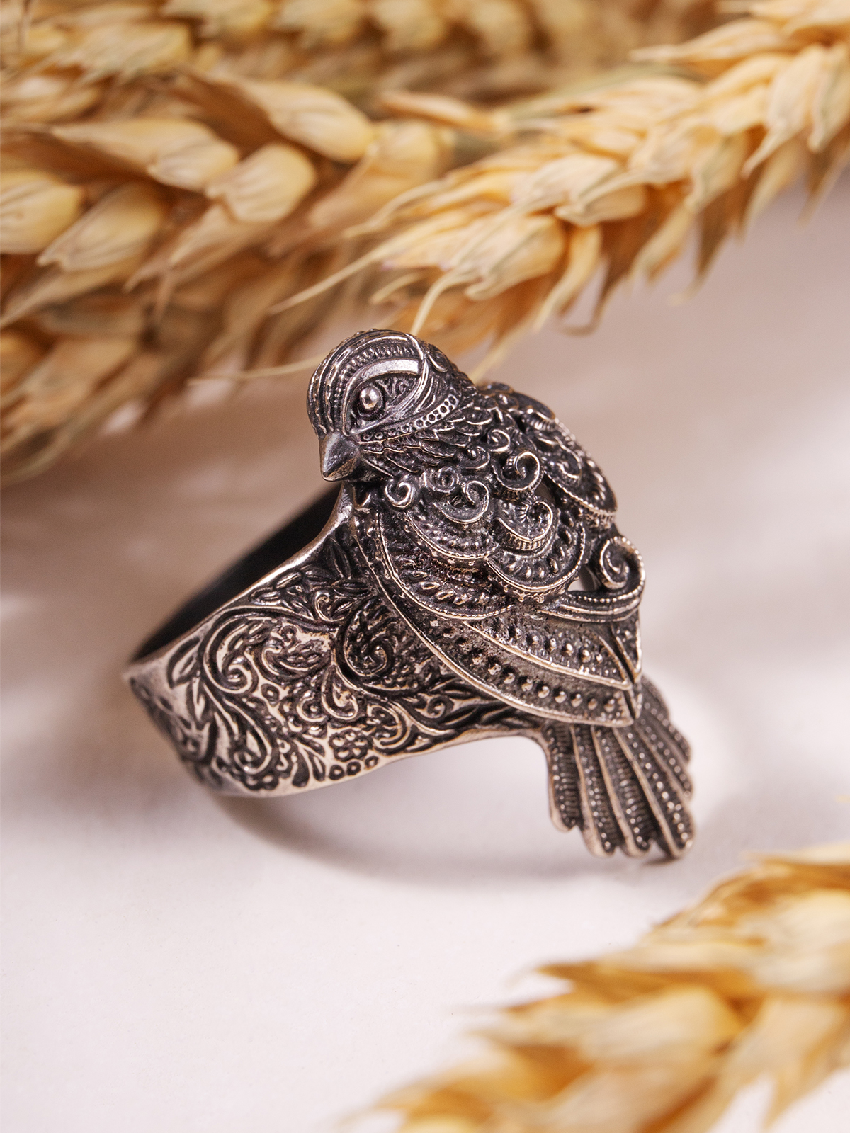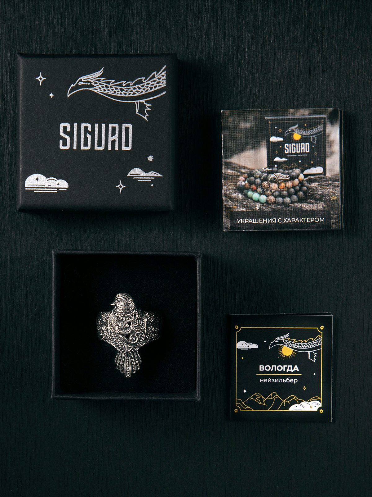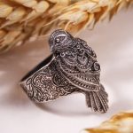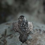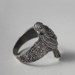 Кольцо отлито из нейзильбера — серебристого сплава меди, никеля и цинка. Не ржавеет, но может со временем потемнеть. Чтобы вернуть блеск, можно использовать средства по уходу за серебром, слабокислые растворы (уксус, лимонная кислота) или мягкие абразивы.
