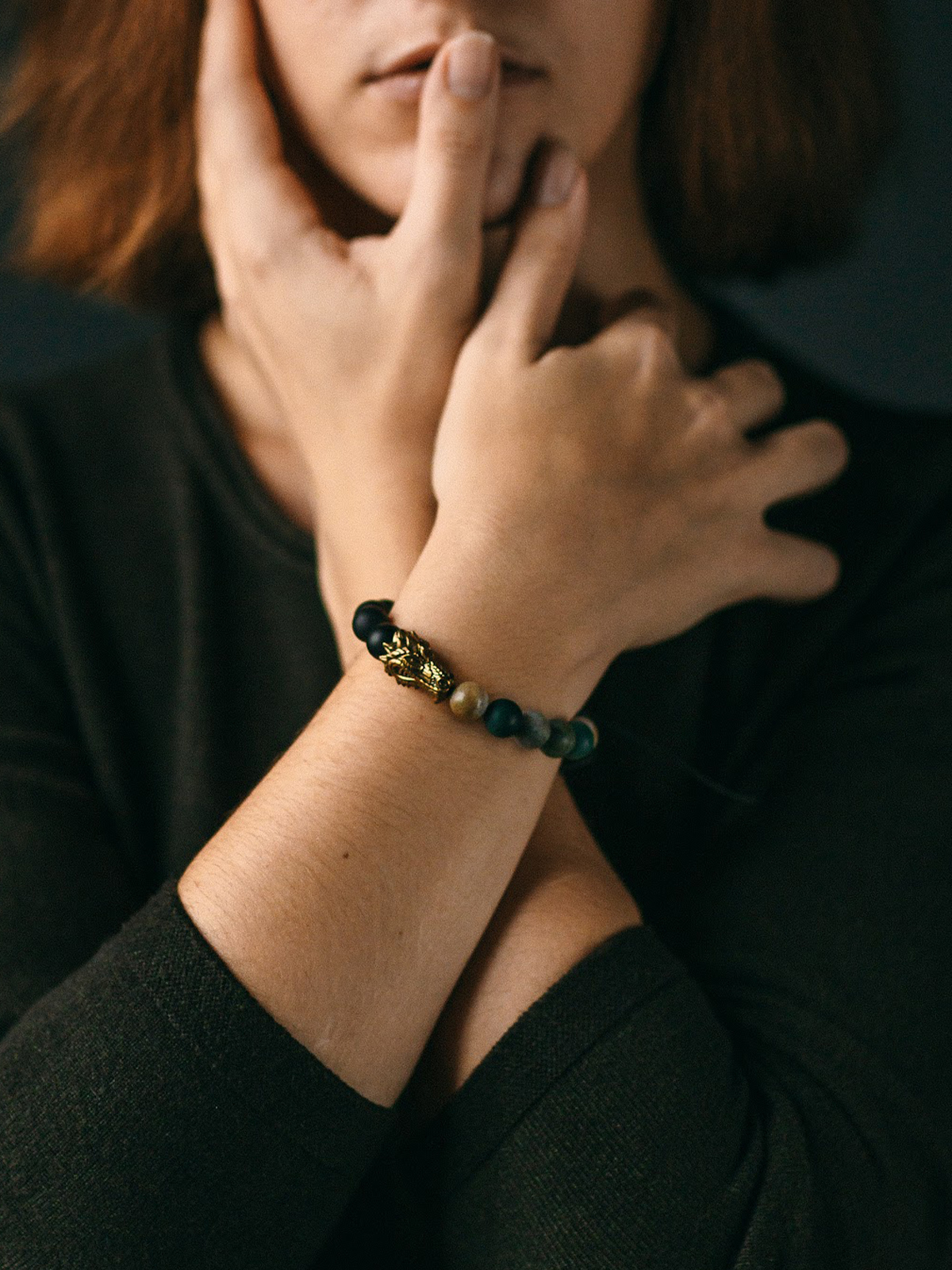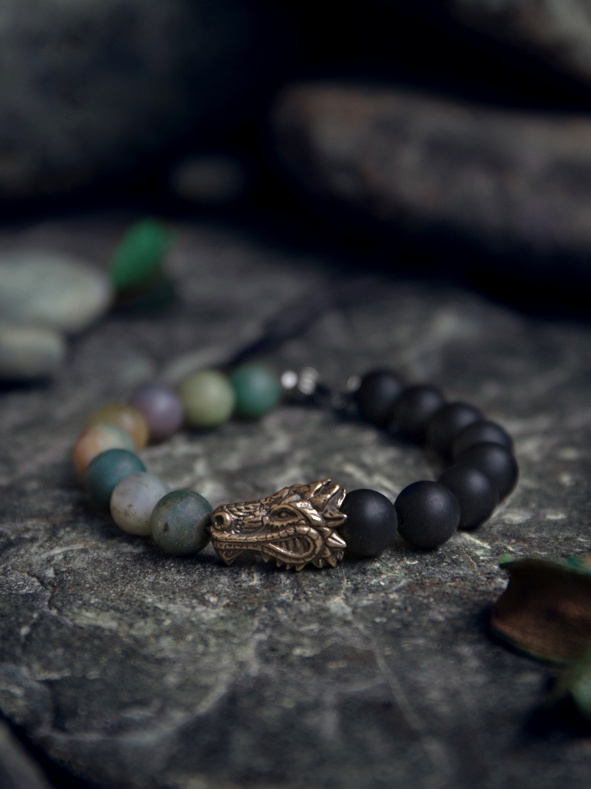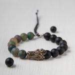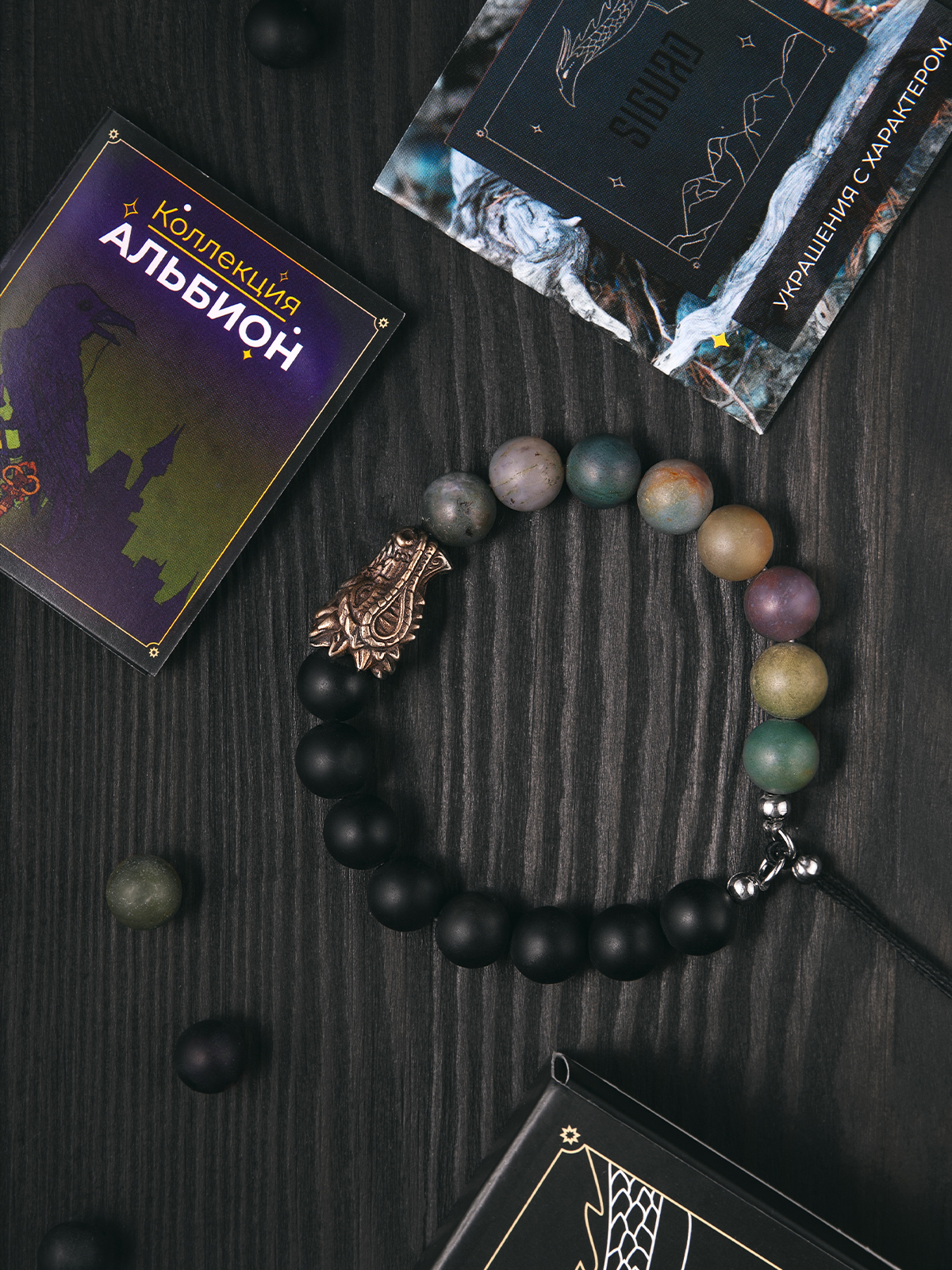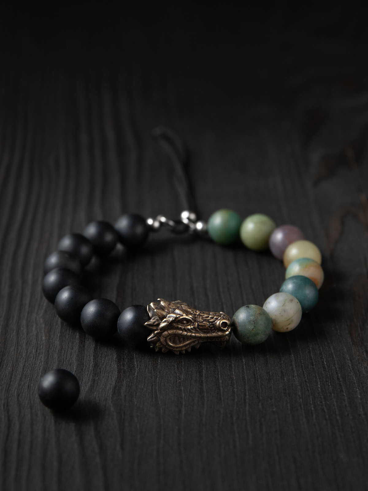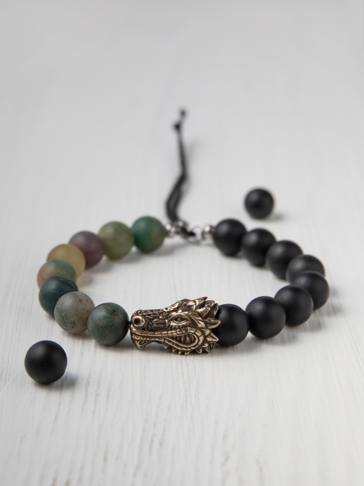 Оникс — камень людей порядочных и мужественных, мудрых и уверенных в себе, истинной аристократии. Считается, что он делает волю твёрже, речь — убедительнее, разум — рациональнее и логичнее. Камню приписывали способность отгонять мрачные мысли, утолять боль и пробуждать в человеке лидерские качества. Индийский агат считается камнем-оберегом, камнем-компасом, указующим владельцу нужный путь. В природе этот агат встречается в нескольких оттенках, поэтому каждый браслет уникален — камни всегда разные. За каждым оттенком закрепились собственные ассоциации. Холодные фиолетовые, серые, зеленоватые тона символизируют способность делать верные выборы. Розовые — сердечные устремления, голубые — творческое начало.