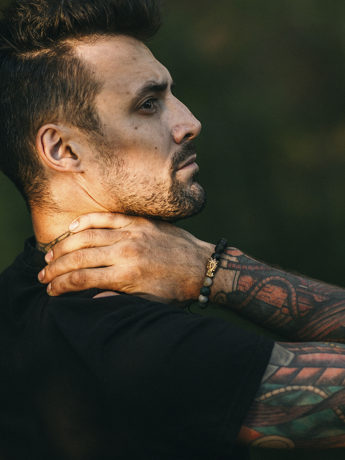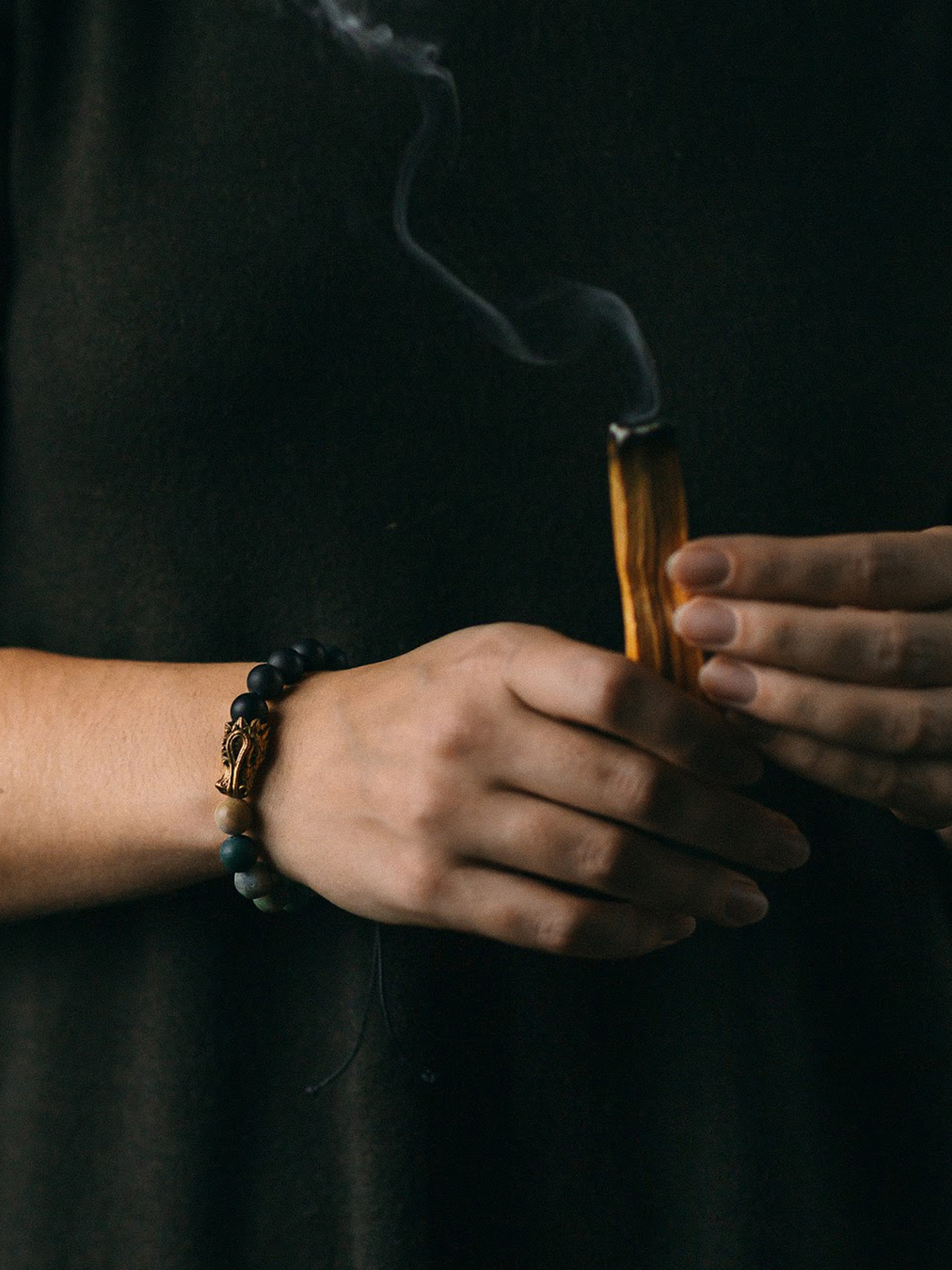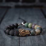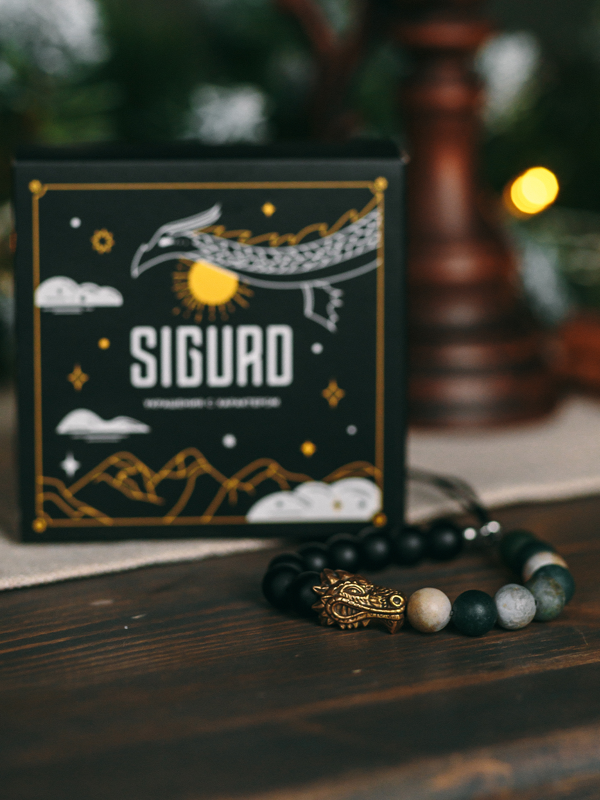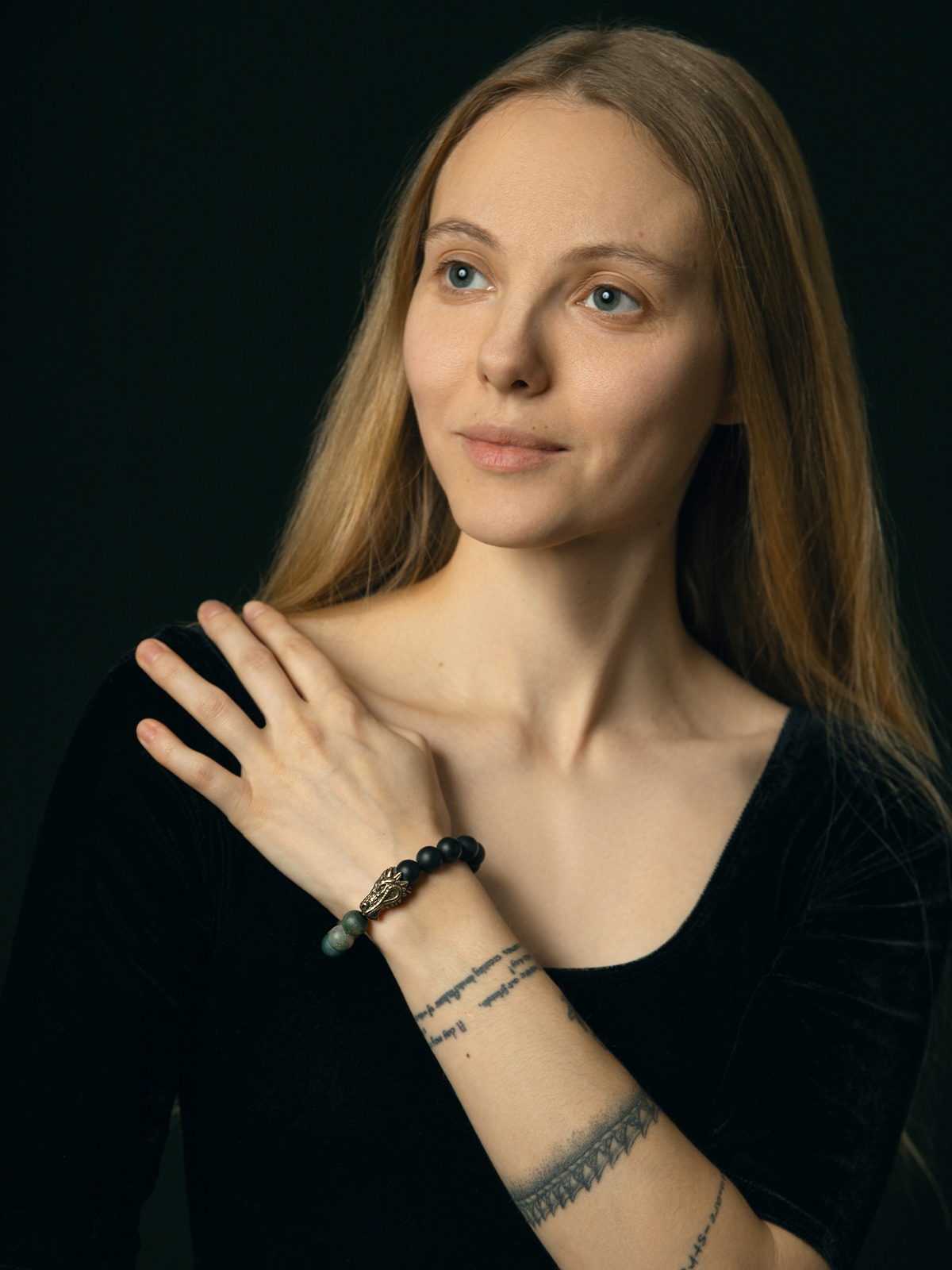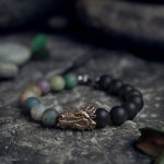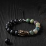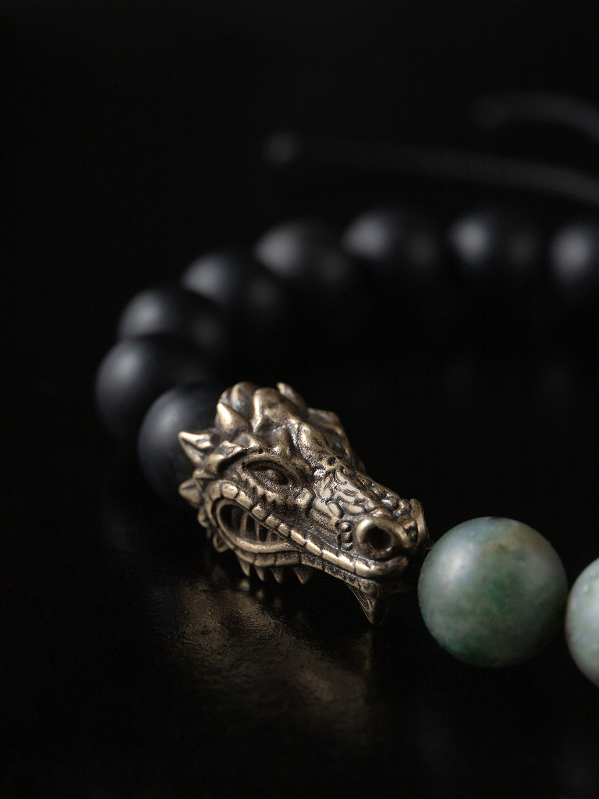 Оникс — камень людей порядочных и мужественных, мудрых и уверенных в себе, истинной аристократии. Считается, что он делает волю твёрже, речь — убедительнее, разум — рациональнее и логичнее. Камню приписывали способность отгонять мрачные мысли, утолять боль и пробуждать в человеке лидерские качества. Индийский агат считается камнем-оберегом, камнем-компасом, указующим владельцу нужный путь. В природе этот агат встречается в нескольких оттенках, поэтому каждый браслет уникален — камни всегда разные. За каждым оттенком закрепились собственные ассоциации. Холодные фиолетовые, серые, зеленоватые тона символизируют способность делать верные выборы. Розовые — сердечные устремления, голубые — творческое начало.